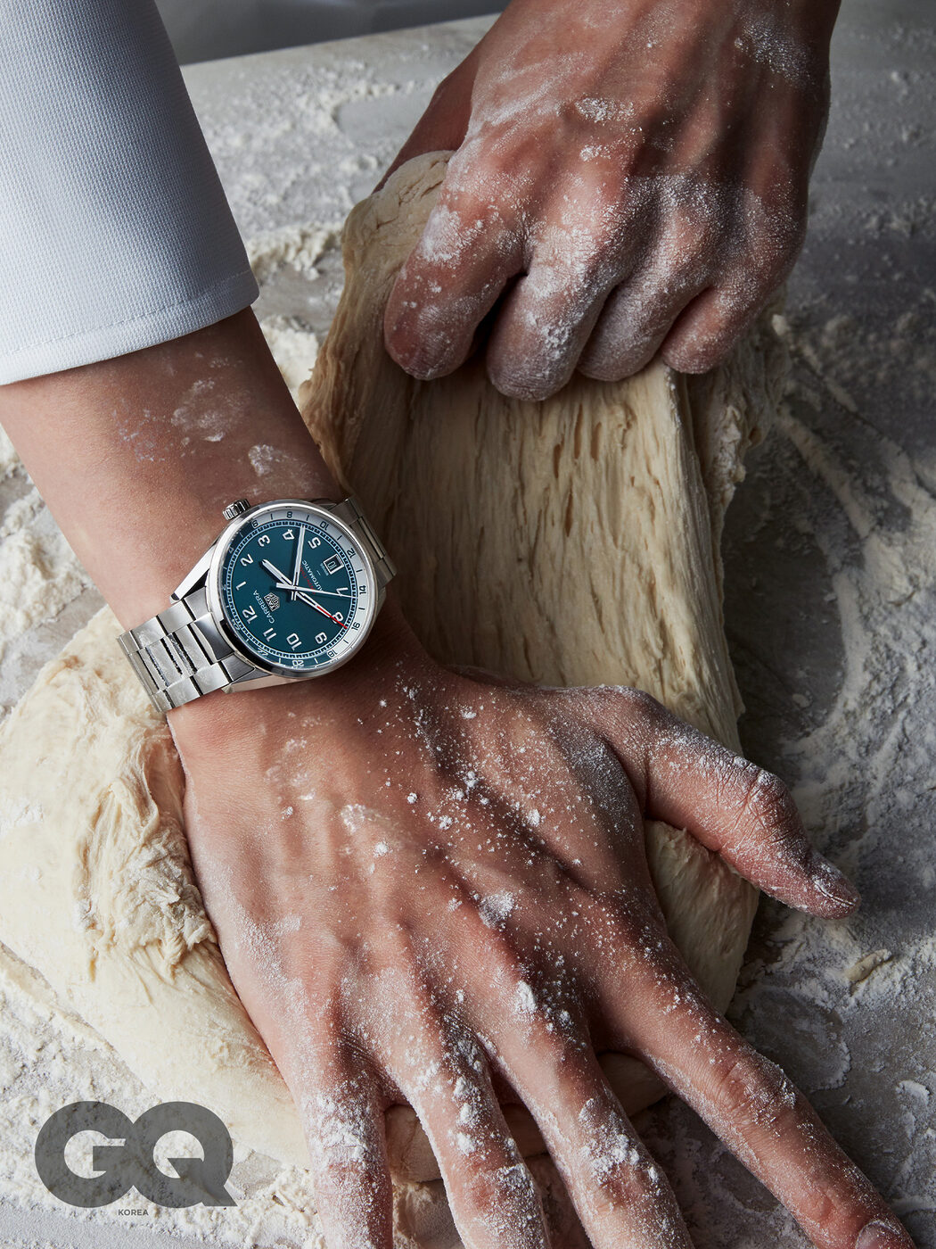 트윈 타임이라는 이름에서 알 수 있듯 동시에 두 시간대를 확인할 수 있다. 틸 컬러로 명명한 다이얼은 선레이 효과를 더해 은은한 빛을 발하며 GMT 핸즈 끝은 레드 컬러로 포인트를 줬다. 24시간 눈금 링에는 화이트와 틸 컬러로 낮과 밤의 시간대를 표시했다. 6시 방향의 날짜 창과 80시간의 파워 리저브, 100미터 방수 기능 등 스포츠 워치의 기능도 어김없이 소화한다. 까레라 데이트 트윈 타임 7백27만원, 태그호이어.