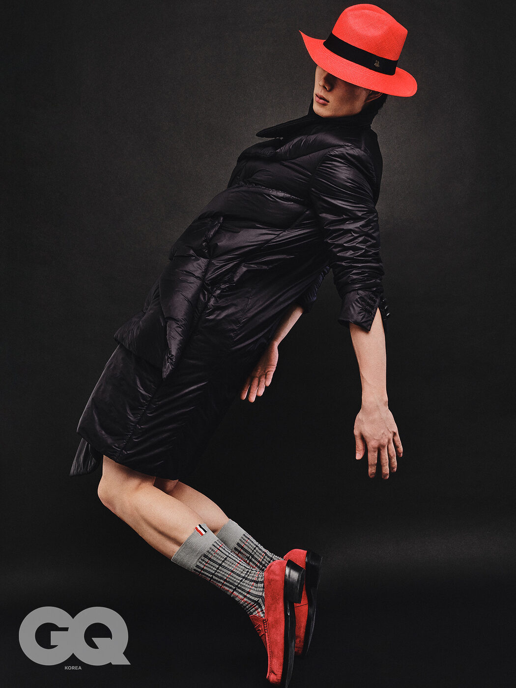 패디드 코트, 무홍. 레드 로퍼, 누스미크. 레드 파나마 햇, 에콴디노. 체크 삭스, 톰 브라운.