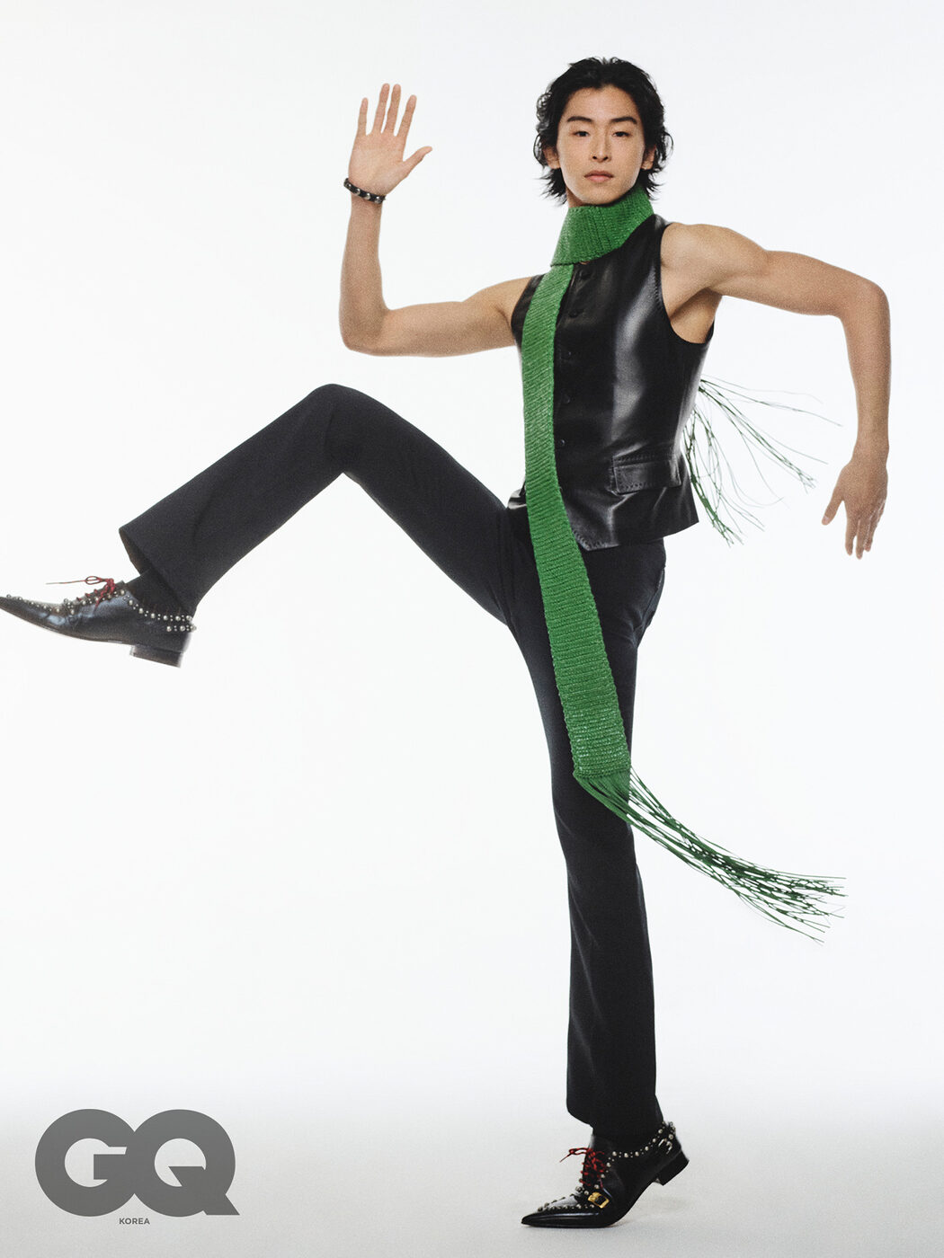 레더 베스트, 김서룡 옴므. 블랙 팬츠, 꾸레쥬. 블랙 모커스 로퍼, 발렌티노 가라바니. 그린 크로셰 스카프, 버버리. 블랙 스터드 브레이슬릿, 베르사체.