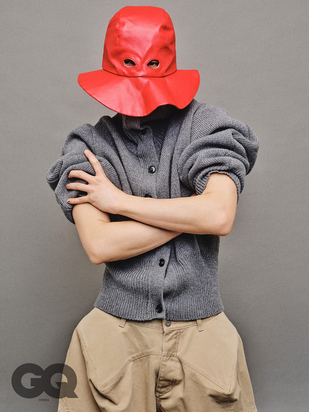 그레이 하이넥 카디건, YCH. 베이지 벌룬 맨 쇼츠, 디올. 레드 카우보이 마스크, 성주.