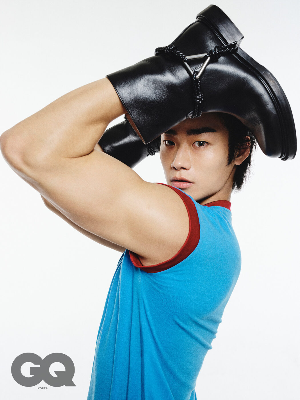 블루 배색 반팔 티셔츠, 베르사체. 제임스 첼시 부츠, 보테가 베네타.