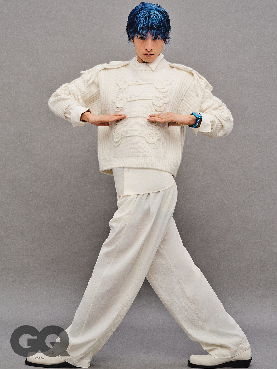 화이트 피셔맨 니트, 겐조. 화이트 포플린 셔츠, 화이트 파라슈트 팬츠, 모두 더 로우. 화이트 워커, 누스미크. 블루 라군 워치, 스와치.