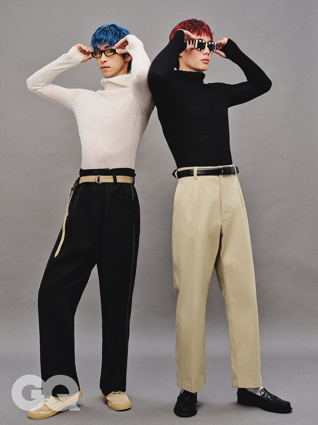 화이트 발라클라바 니트 톱, 렉토. 블랙 핀턱 팬츠와 베이지 버클 벨트, 모두 메종 마르지엘라. 베이지 스웨이드 스니커즈, 몽클레르. 옐로 틴티드 선글라스, 발렌티노. 블랙 발라클라바 니트 톱, 렉토. 베이지 코튼 팬츠와 블랙 벨트, 모두 로로피아나. 블랙 로퍼, 프라다. 스트라이프 선글라스, 발렌티노.