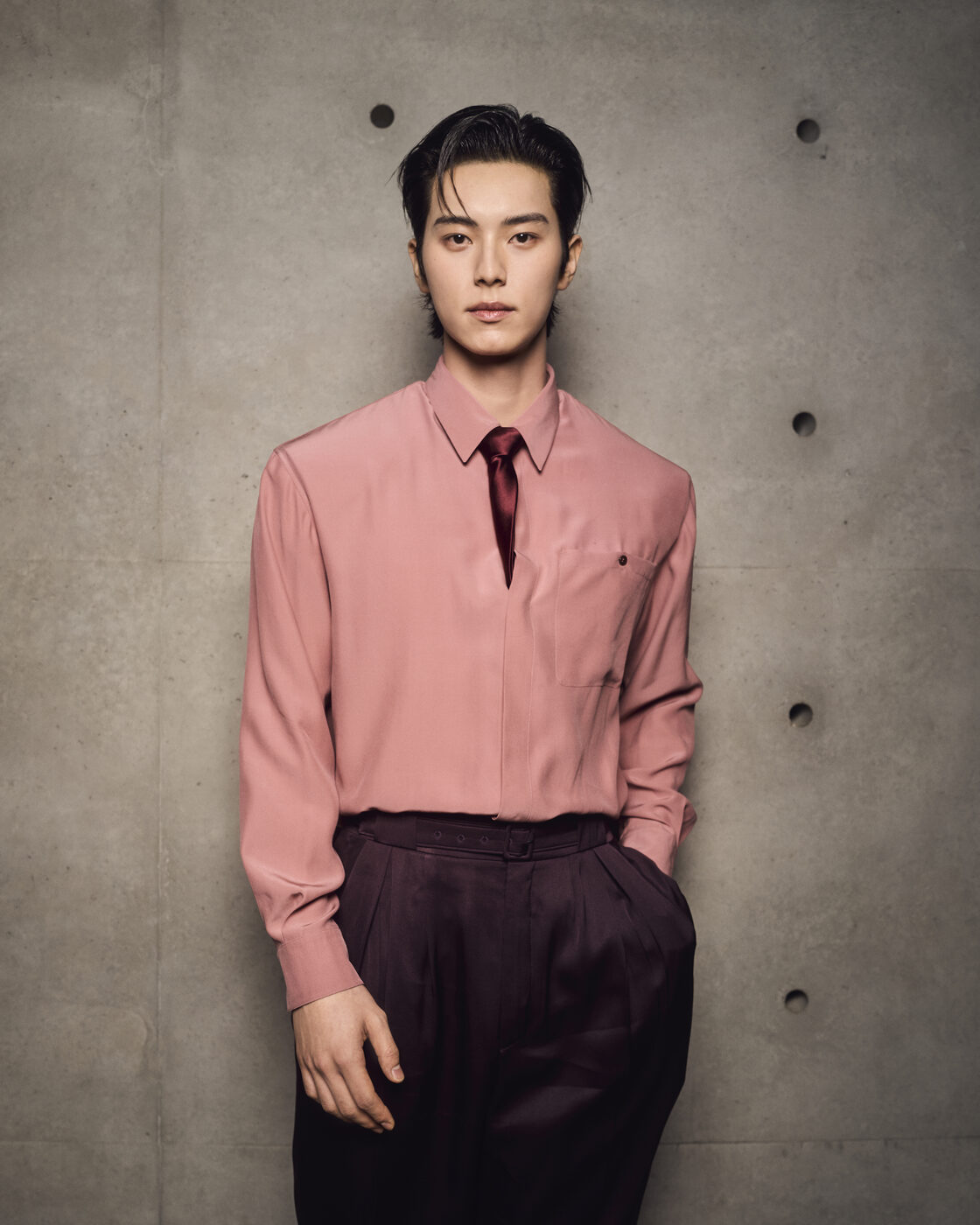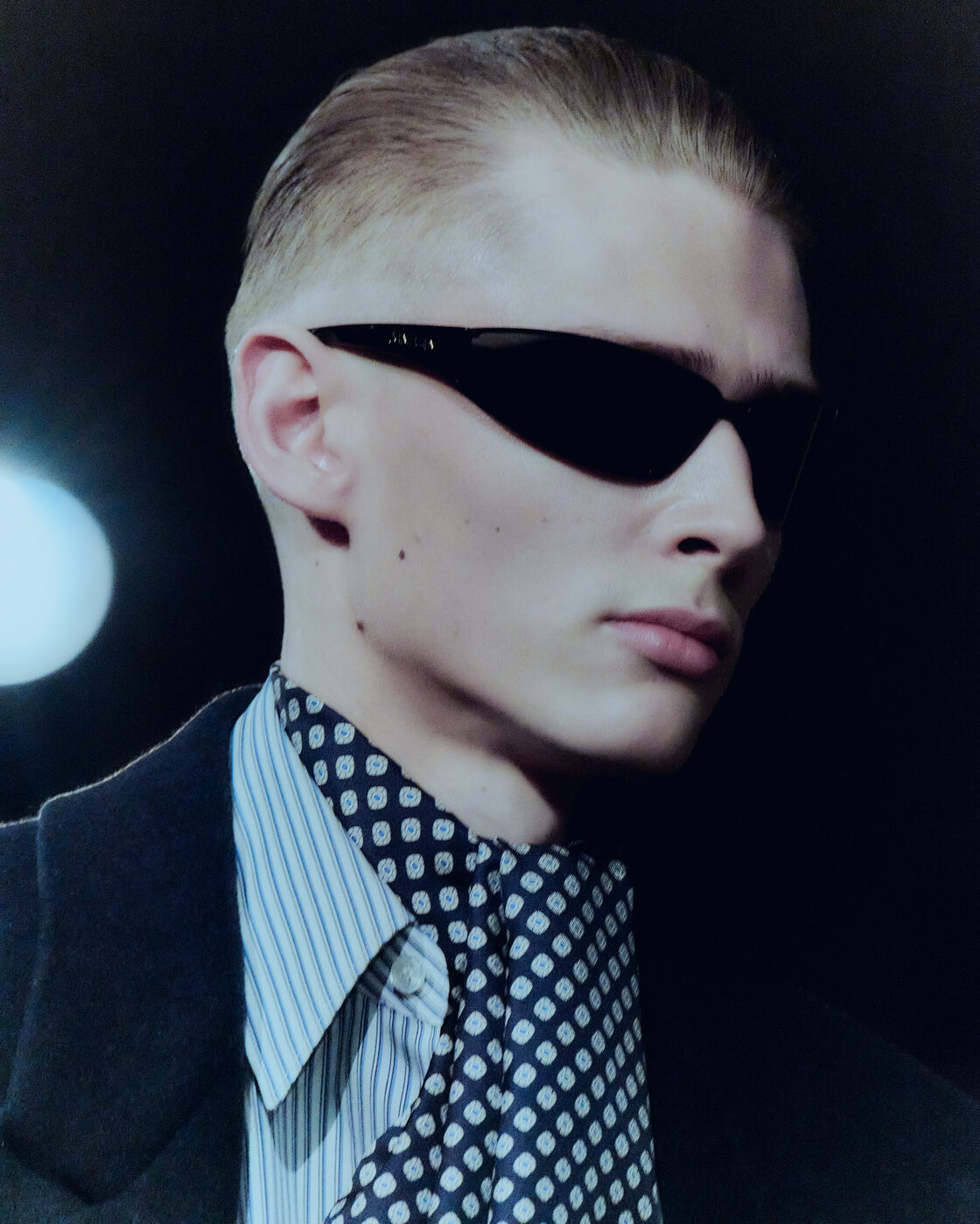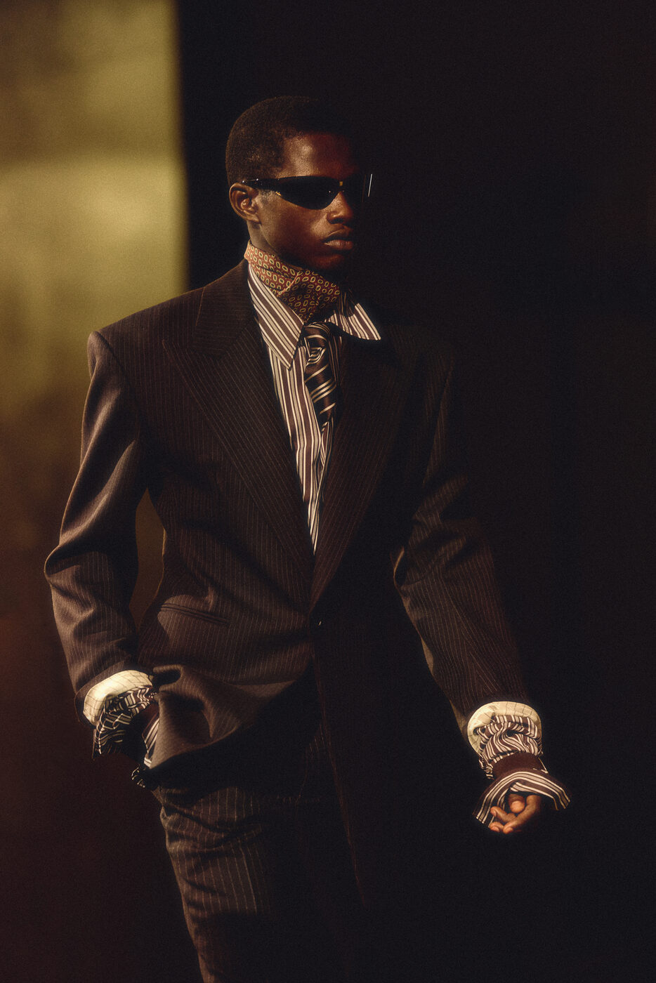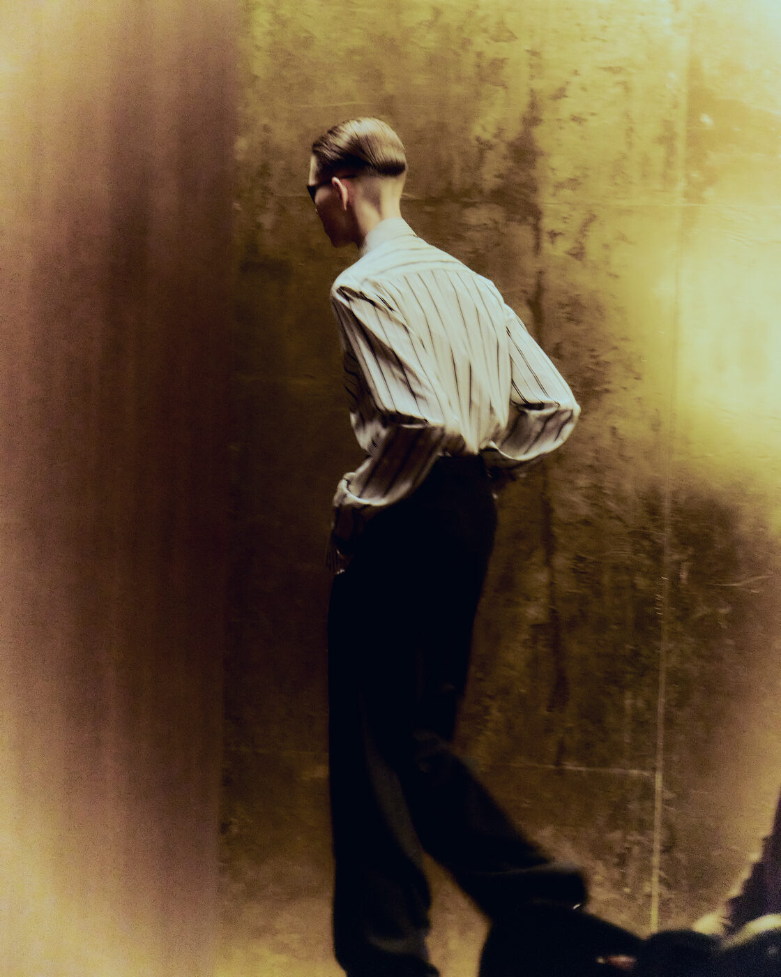 이제부터는 밤이라 부를 수 있는 9시. 안토니 바카렐로는 2026 F/W 생 로랑 남성 컬렉션을 위해 쇼 시작 시간까지 빈틈없이 맞춰놨다. 엽서 속에 담긴 완벽한 파리의 환상을 구현하기 좋은 시간이다. 언제나 그렇듯 쇼에 초대받은 사람 모두의 얼굴을 볼 수 있는, 런웨이를 원탁 삼아 빙 둘러앉은 시팅이었다. 이번에는 딱딱하고 단단한데 등받이 없는 되똑한 나무 의자 대신 부드럽고 온몸을 내던질 수 있는 가죽 카우치를 준비했다. 밤 9시라면 이런 의자가 좋지. 마침 밖은 부슬부슬 비도 내렸다. 우산이 거추장스러울 정도로 소소하게 내려, 찰리 허넴 옆에 앉은 오스틴 버틀러의 곱슬머리는 평소보다 살짝 더 구불거렸고, 라미 말렉의 선글라스에도 미세한 물방울이 맺힐 뿐이었다. 지난 시즌 안토니는 가장 화려한 컬러 팔레트로 런웨이를 물들였다. 더스티 바이올렛을 입은 엔씨티의 텐과 러스트 오렌지의 켄토 야마자키, 인디언 핑크를 입은 배우 이채민과 머스터드 옐로 수트를 입은 코노 스토리가 지난 런웨이를 상기시켰다.