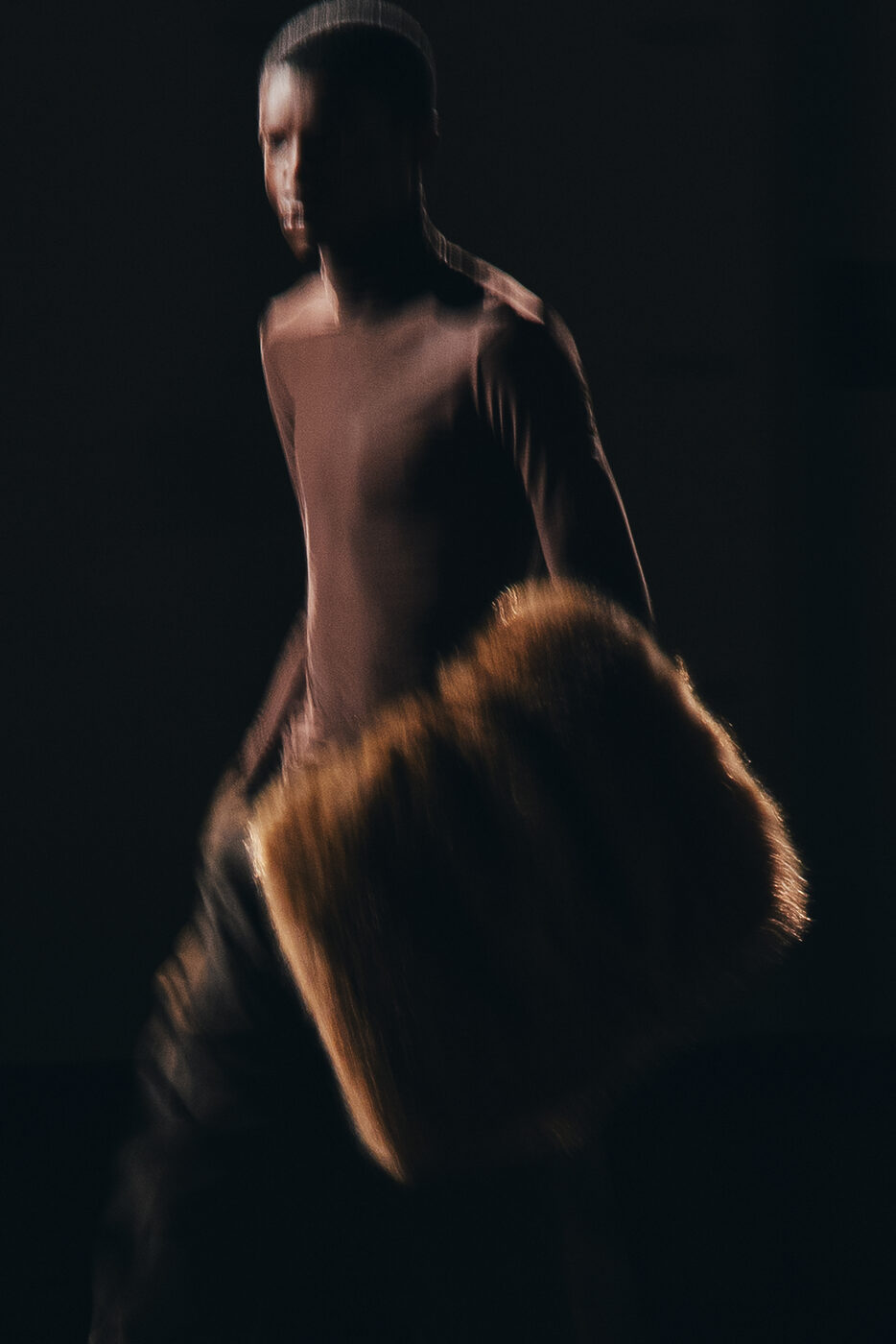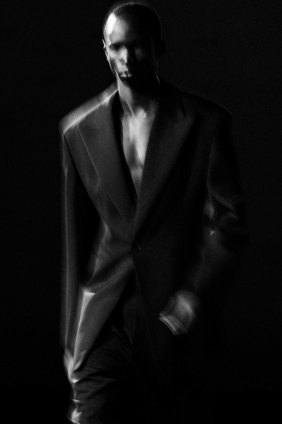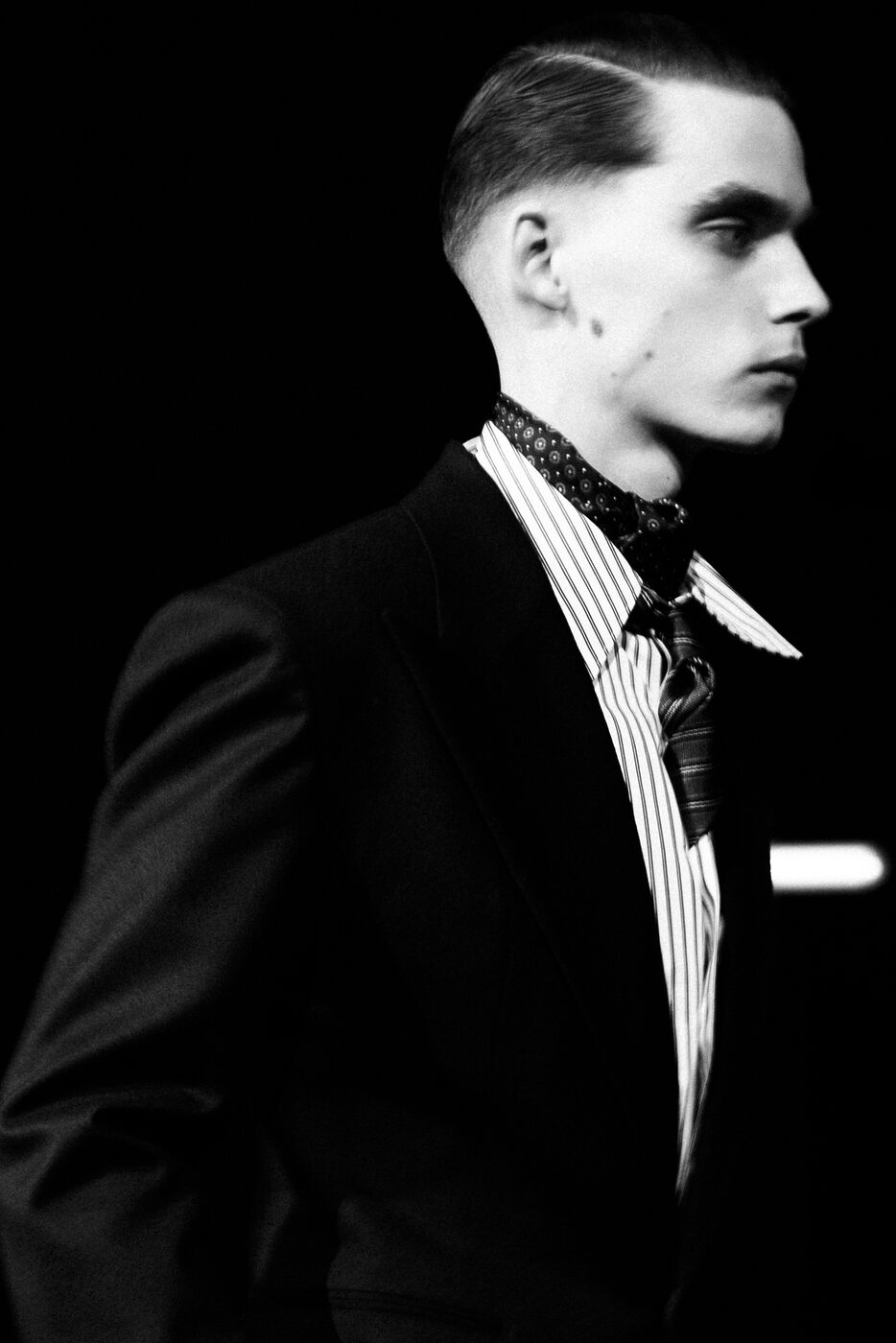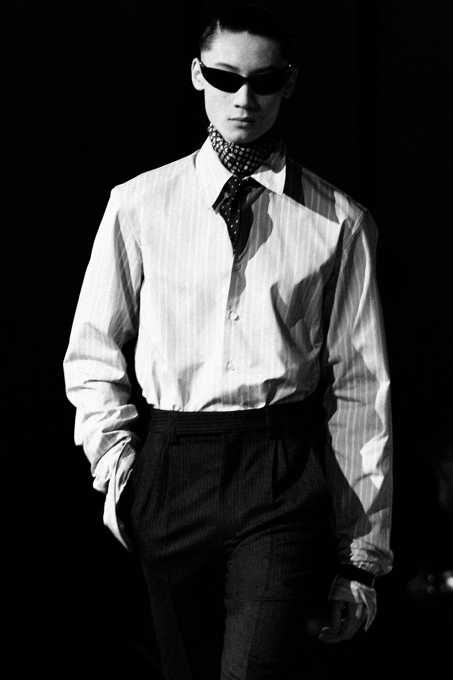 예민한 핀 조명이 켜지고 장중한 오케스트라와 오페라 음악이 들리자 연약함과 강인함이 공존하는 날렵하고 유려한 실루엣들이 등장했다. 익숙한 수트와 친숙한 레더는 과장된 퍼와 날카로운 페이턴트로 변주를 주며 생 로랑 하우스의 새로운 르 스모킹 Le Smoking을 완성했다. 날카로운 어깨선은 드러내되, 전체적인 실루엣은 여미고 감추는 방식을 택했고 강조와 절제 사이를 아슬아슬하게 맴돌았다. 갑옷에 가까운 코트와 페이턴트 니하이 부츠는 무게감을 더했고, 실크 애스콧 타이와 와이드 팬츠는 우아하고 풍성한 볼륨감을 부풀렸다. 블랙과 브라운과 네이비 그리고 애스콧 타이의 레드가 다였다. 바카렐로는 1956년 출간된 제임스 볼드윈의 <지오반니의 방 Giovanni’s Room>에서 이번 컬렉션을 시작했다. 연인인 데이비드와 지오반니의 심리적, 성적, 감정적인 긴장감에서 남성성과 남성다움의 의미를 찾아갔다. 특히 그가 매료된 건 새벽녘. 밤 이후의 아침을 떠올리며 생 로랑의 클래식 모티프를 포착했다. 동이 트기 전에 일어나는 친밀하고도 특별한 이 경계의 시간에서 히치콕의 영화와 헬무트 뉴튼의 사진이 얼핏 스쳐가기도 했다. 쇼가 끝난 뒤 새벽이 가까워진 파리 시내는 유리잔도 물들일 만큼 진한 론 와인이 생각나게 했다. 누군가는 10년 전에 끊은 담배를 다시 피웠다. 파리의 새벽은 여전히 많은 비밀을 간직하고 있다.