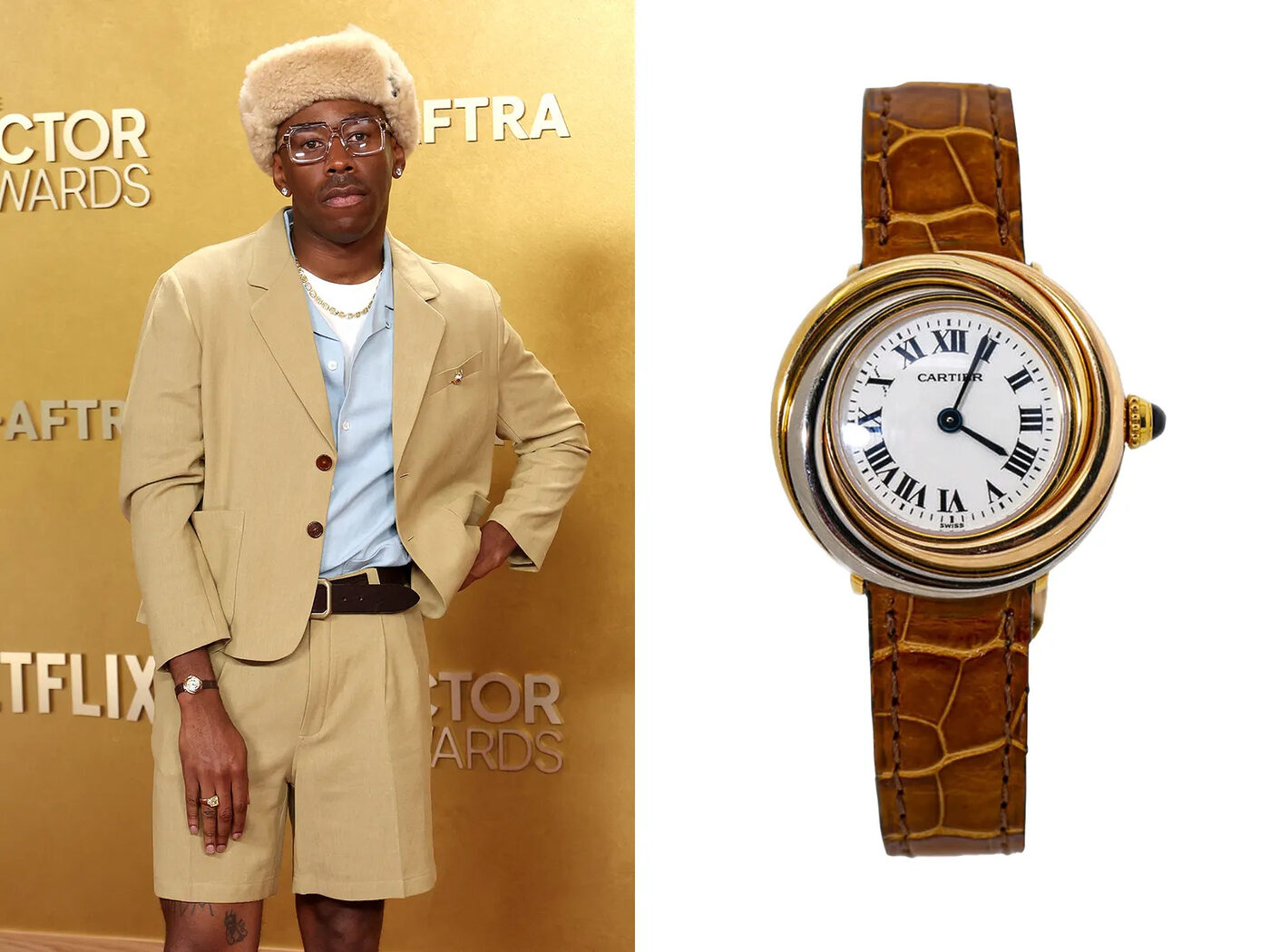 타일러 더 크리에이터는 까르띠에 트리니티를 착용했다. 까르띠에의 트리니티 컬렉션은 반지로 가장 유명하지만, 많은 이들이 가장 좋아하는 시계 수집가인 그가 이제는 시계까지 주목받게 만들고 있다. 케이스가 서로 얽힌 링처럼 보인다는 점이 포인트다. 27밀리미터로 ‘아주 작은 시계’ 범주에 속하며, 3백만 원 대의 가격으로 세컨드 마켓에서 구할 수 있다는 점도 매력적이다.