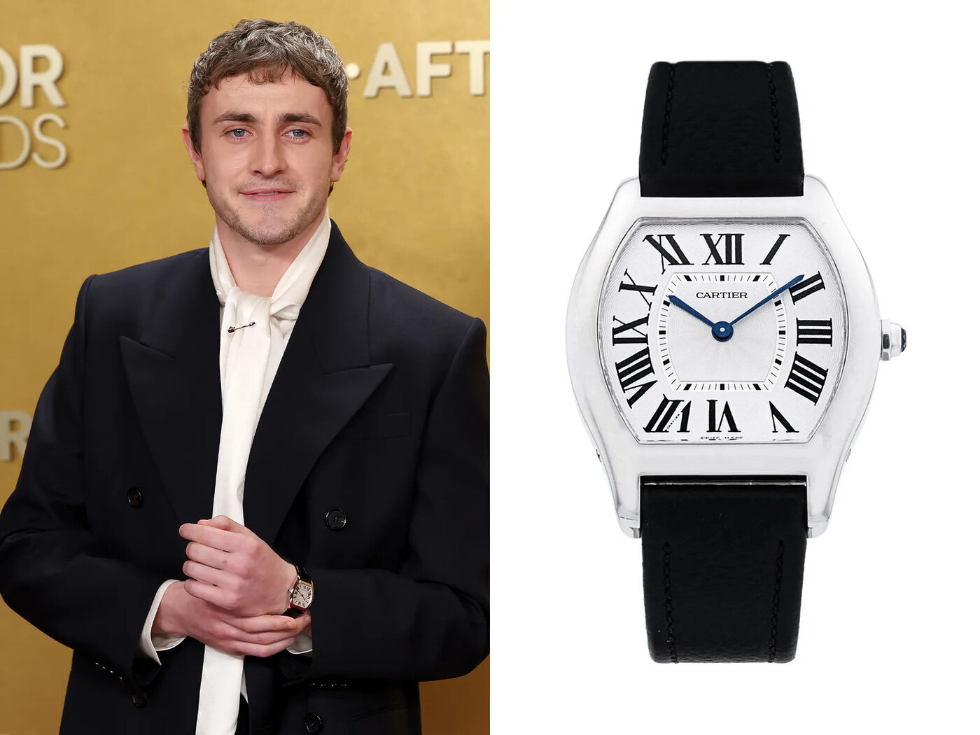 폴 메스칼은 까르띠에 토르튀를 착용했다. 또 한 번의 메스칼과 까르띠에의 만남이다. 그는 올해 초 골든글로브에서 골드 버전을 착용했는데, 이번에는 화이트 골드 버전을 선택했다. 단종 모델이지만 기술적으로도 상당히 완성도가 높다. 단순히 예쁜 얼굴만은 아니다. 물론 메스칼도 마찬가지다.