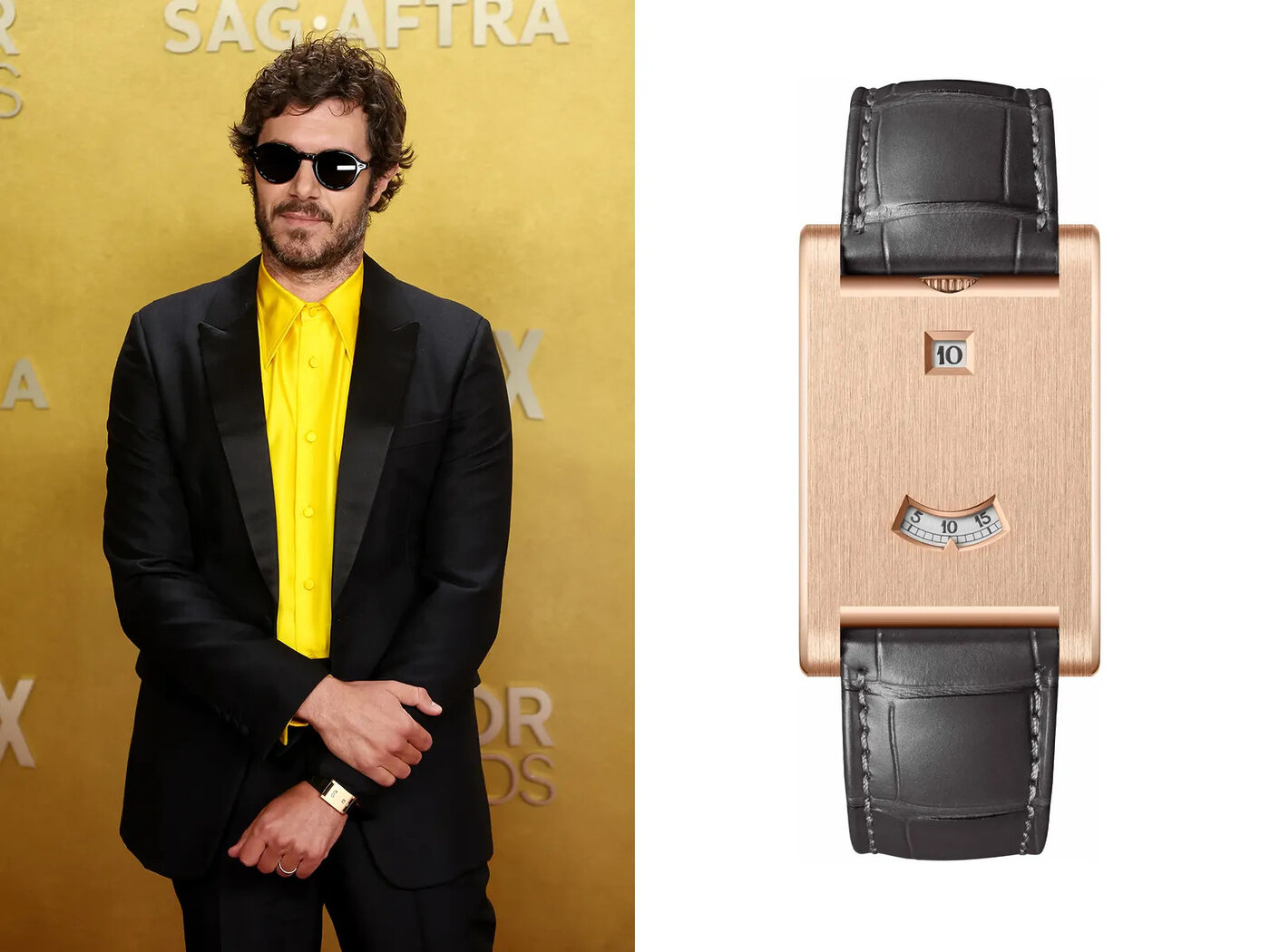 애덤 브로디는 까르띠에 탱크 아 기쉐를 착용했다. 그는 이런 행사에 등장할 때마다 늘 멋진 시계를 착용한다. 이번 모델은 특히 귀하고 구하기도 어렵다. 점핑 아워 모델이 큰 인기를 끄는 요즘, 로즈 골드 탱크 아 기쉐는 독보적인 존재다.