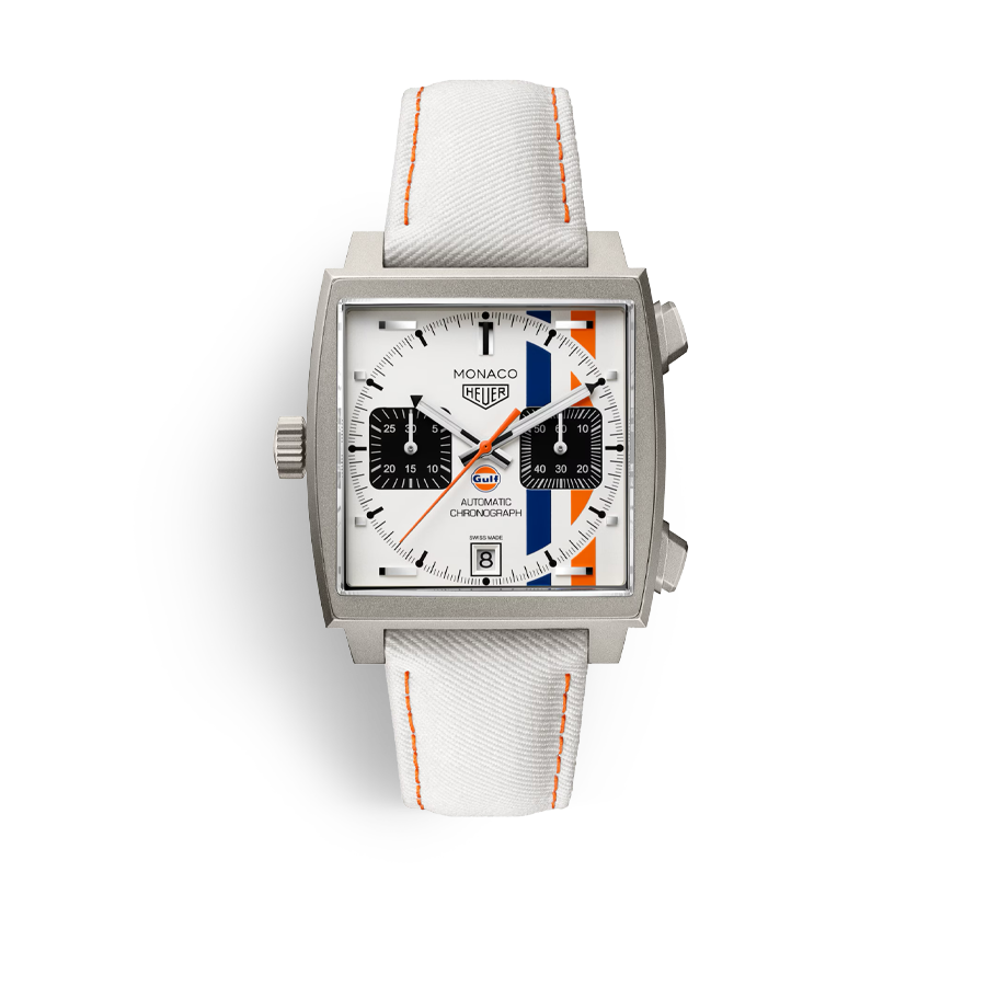 푸른색, 흰색, 주황색이 어우러진 다이얼과 미묘하게 들어간 걸프 로고는 영화 속 맥퀸이 탔던 걸프 후원 포르쉐 917의 리버리를 기념한다. 모나코는 태그호이어 카탈로그에서 가장 인기 있는 모델 중 하나지만, 이 버전은 모터스포츠 팬을 위한 특별한 선택이다.