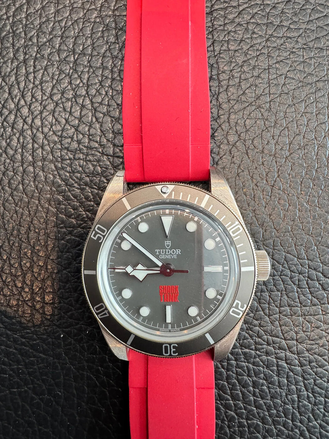 그냥 빨간색이 아닙니다. 팬톤 485C입니다. 샤크 탱크 시즌 3 때 스틸 데이토나에 빨간 밴드를 착용했는데, 다음 시즌 의상 담당자가 “연속성 유지”를 이유로 계속 빨간 스트랩을 유지하라고 했어요. 그렇게 시작됐죠.