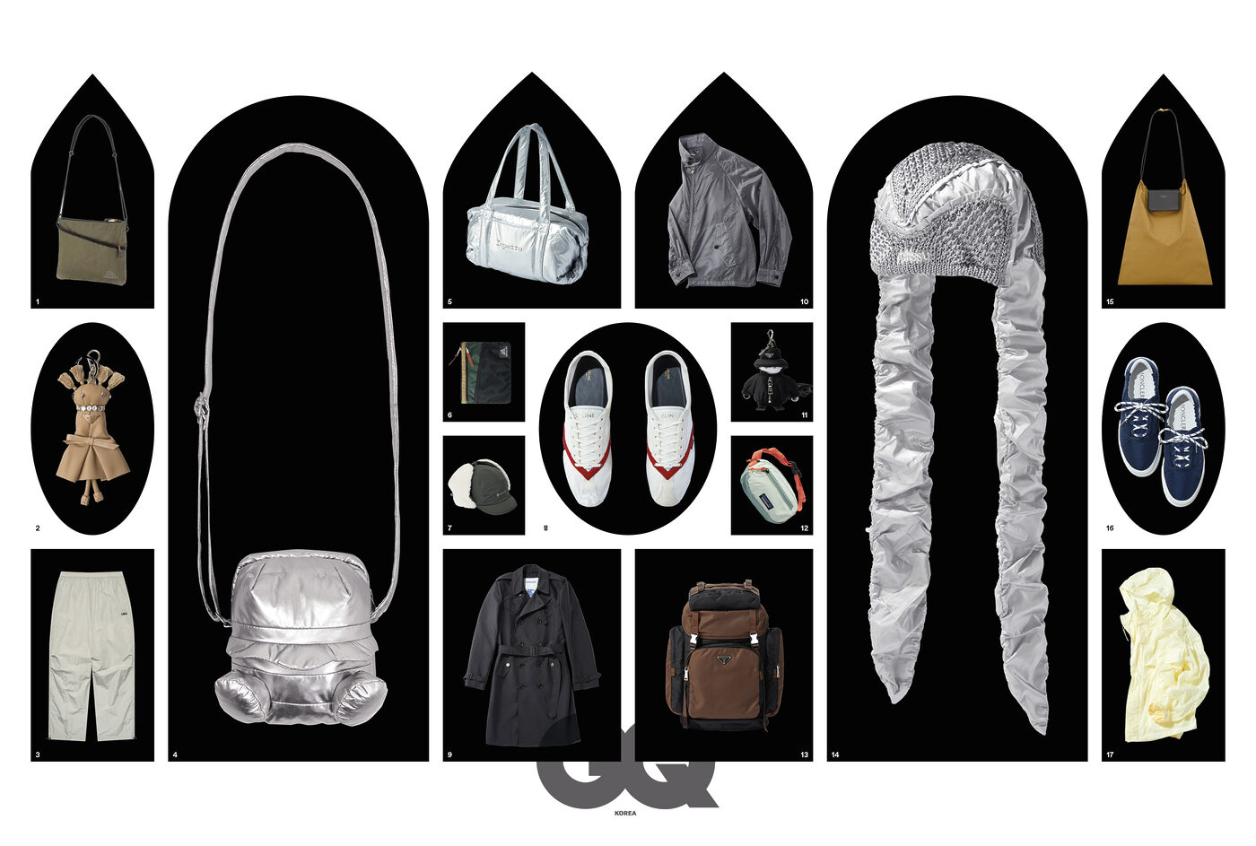 1 사선 포켓 디테일 초경량 카키 사코슈 AL 크로스 백 5만9천원, 그레고리. 2 크리스털 장식의 베이지 리나일론 테디 키링 1백13만원, 프라다. 3 라이트 그레이 OG 에센셜 와이드 팬츠 7만9천원, LMC by 하이츠 스토어. 4 실버 버거 크로스 백 21만1천원, 반디 더 핑크 by 노클레임. 5 실버 빅 글라이드 숄더백 21만8천원, 레페토. 6 메시 포켓 클래식 사코슈 M 백 5만9천원, 그레고리. 7 양털 트리밍 이어플랩 프리마로프트 트래퍼 햇 7만9천원, 스노우피크. 8 V 모티프 레더 포인트의 플랫 스니커즈 1백20만원, 셀린느. 9 네이비 폭스필드 트렌치코트 가격 미정, 버버리. 10 초경량 G4 박스 라이트 립 재킷 44만5천원, 바라쿠타 by 샌프란시스코 마켓. 11 지퍼 포켓 디테일 블랙 리나일론 소프트 로봇 키링 1백73만원, 프라다. 12 테라비아 미니 힙색 6만9천원, 파타고니아. 13 블랙&브라운 아웃 포켓 장식의 리나일론 백팩 6백만원, 프라다. 14 메시 니트&나일론 드레이프 플랩 그레이 레비 비니 14만8천원, 어티슈. 15 카라 비너 숄더 스트랩 폴라드 폴딩 파우치 2백46만원, 생 로랑 by 안토니 바카렐로. 16 네이비 베라 레저 스니커즈 76만원, 몽클레르. 17 초경량 아이보리 윈드 브레이커 14만9천원, H&M.
