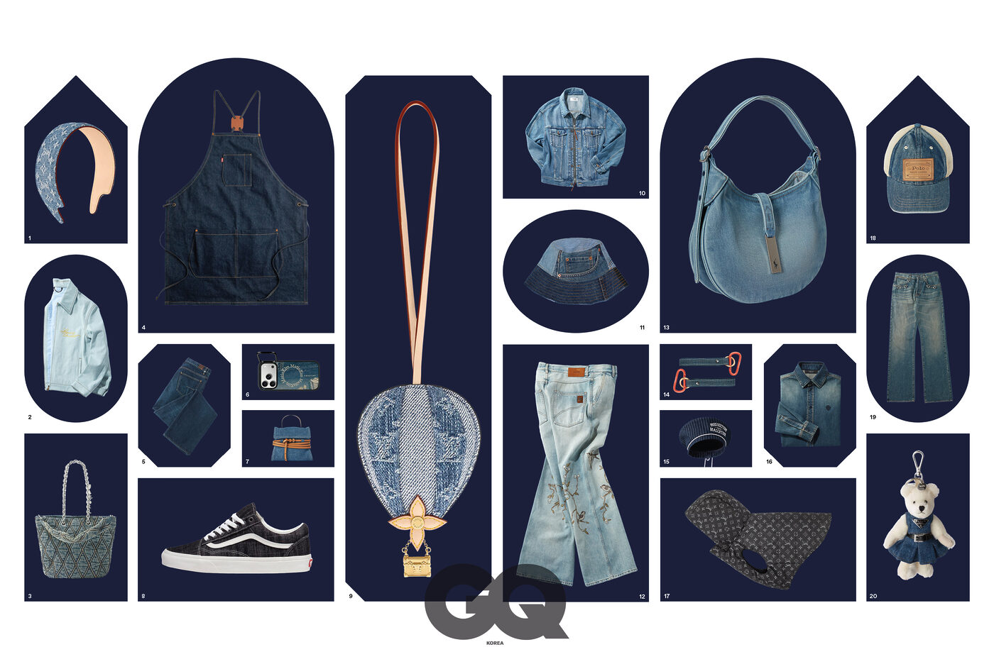 1 모노그램 패턴 와이드 헤드 밴드 87만원, 루이 비통. 2 블루밍 LV 워크웨어 블루종 재킷 가격 미정, 루이 비통. 3 로고 펜던트 장식 숄더 체인 퀼팅 쇼퍼 백 92만원, 디젤. 4 데님 앞치마 6만9천원, 리바이스. 5 클래식 데님 맨 팬츠 가격 미정, 디올. 6 마뗑킴 데님 실사 프린트 카메라 링스탠드 아이폰 17 프로 케이스 10만8천원, 케이스티파이. 7 마이크로 미니 사이즈 타이 미 백 1백54만원, 모스키노. 8 블랙 올드스쿨 스레디스 데님 9만5천원, 반스. 9 열기구 모티프의 LV 스카이 백 주얼 참 90만원, 루이 비통. 10 가죽 손잡이 디테일 집업 트러커 재킷 2백60만원, 셀린느. 11 빈티지 데님 리메이크 패치워크 버킷 햇 11만8천원, 트리프티룩 by ETC 서울. 12 꽃나무와 새 자수 디테일 팬츠 가격 미정, 아미리. 13 시그니처 포니 메탈 플래크 장식의 ID 데님 스몰 숄더백 99만9천원, 폴로 랄프 로렌. 14 블루 데님 카라비너 키링 가격 미정, 할리케이. 15 스트라이프 베레 1백4만원, 루이 비통. 16 크레스트 자수 셔츠 가격 미정, 구찌. 17 모노그램 패턴 도그 푸퍼 재킷 1백64만원, 루이 비통. 18 트러커 캡 가격 미정, 폴로 랄프 로렌. 19 홀스빗 장식의 플레어 데님 팬츠 1백93만원, 구찌. 20 데님 드레스 테디 키링 1백26만원, 프라다.