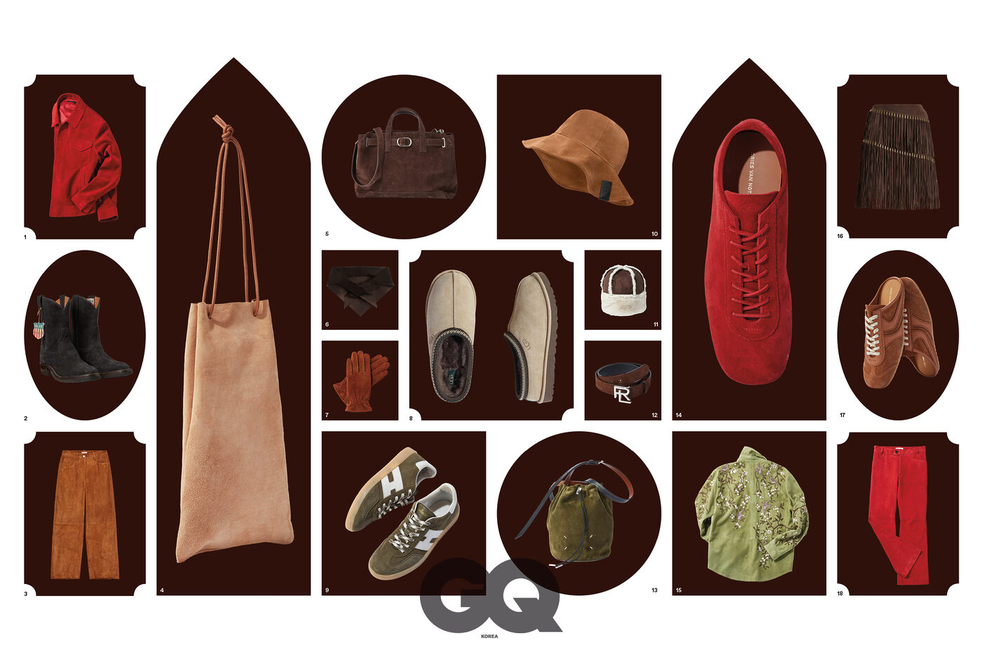 1 레드 셔츠 재킷 가격 미정, 톰 포드. 2 블랙 러프아웃 웨스턴 부츠 2백만원, 더블알엘 랄프 로렌. 3 캐멀 릴랙스드 팬츠 62만9천원, 아르켓. 4 사이드 지퍼 디테일 드로스트링 백 45만7천원, 아미아칼바 by 샌프란시스코 마켓. 5 CD 버클 벨트 장식의 다크 브라운 노르망디 토트백 9백90만원, 디올. 6 다크 브라운 트라이앵글 스카프 16만9천원, 코스. 7 윌리 터치 장갑 9만4천원, 사르토르 리사르투스. 8 양털 안감의 샌드 타스만 슬리퍼 19만8천원, 어그. 9 격자무늬로 가공한 올리브 그린 스웨이드 쿨 스니커즈 58만원, 호간. 10 로고 탭 장식 캐멀 버킷 햇 가격 미정, 로에베. 11 양털 트리밍 페이크 스웨이드 돔 햇 8만9천원, 디오디. 12 다크 브라운 알엘 로고 버클 벨트 가격 미정, 랄프 로렌 퍼플 라벨. 13 올리브 그린 드로스트링 크로스 보디 버킷 백 1백54만원, 메종 마르지엘라. 14 슬림 실루엣 마라톤 스니커즈 82만원대, 드리스 반 노튼. 15 꽃나무와 새 자수 디테일의 올리브 그린 셔츠 가격 미정, 아미리. 16 다크 브라운 브리엘 프린지 트림 램 스웨이드 스커트 4백15만원, 랄프 로렌. 17 브라운 슬림 실루엣 스니커즈 뮬 68만원대, 드리스 반 노튼. 18 레드 플레어 팬츠 가격 미정, 어네스트 W. 베이커 by 10 꼬르소 꼬모.