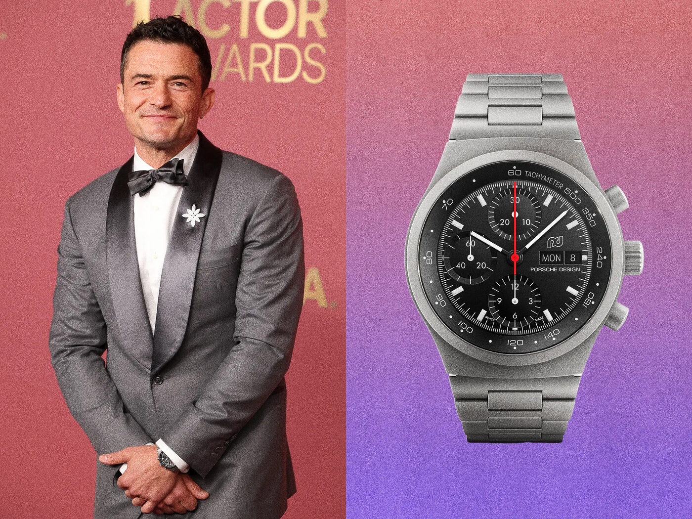 올랜도 블룸이 포르쉐 디자인 크로노그래프 리미티드 에디션의 매트 티타늄 케이스에 어울리는 회색 턱시도를 입었다.