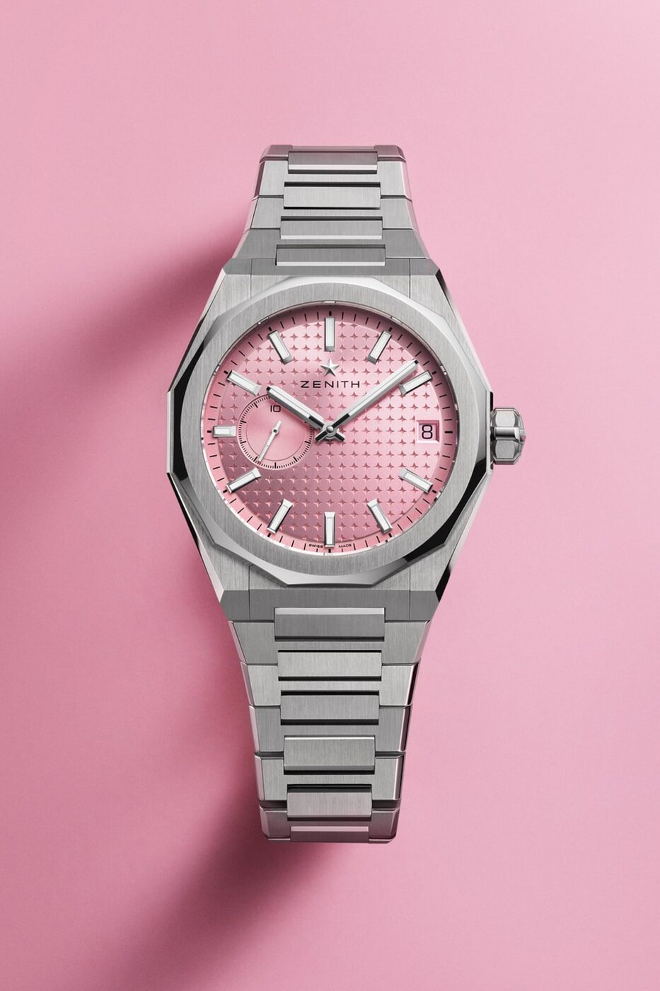 앞선 두 모델과 상반된 분위기의, 현대적이고 스포티한 핑크 워치로는 제니스의 디파이 스카이라인이 있다. 아주 연한 파스텔 톤의 핑크 컬러 다이얼은 기요셰 패턴 덕분에 화려한 입체감을 자아낸다. 1969년 초기 디파이 모델에서 영감받은 8각형 케이스와 12각형 베젤은, 36mm임에도 손목 위에서 매우 단단하고 강렬한 인상을 준다. 엘리트 670 자동 무브먼트가 탑재됐고 50시간의 파워 리저브와 100m 방수 기능을 제공한다. 버튼 하나로 메탈 브레이슬릿과 핑크색 러버 스트랩을 교체할 수 있어 드레스워치와 캐주얼워치 양쪽으로 활용할 수 있다.