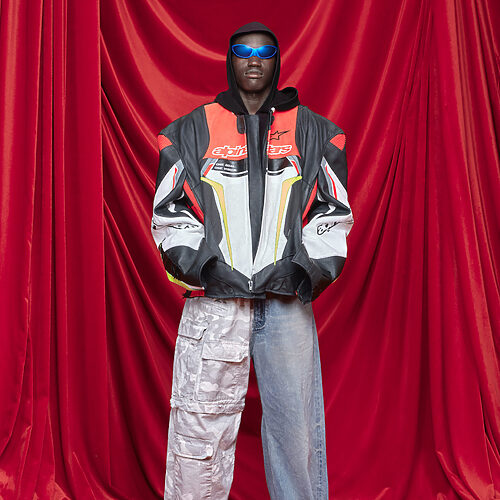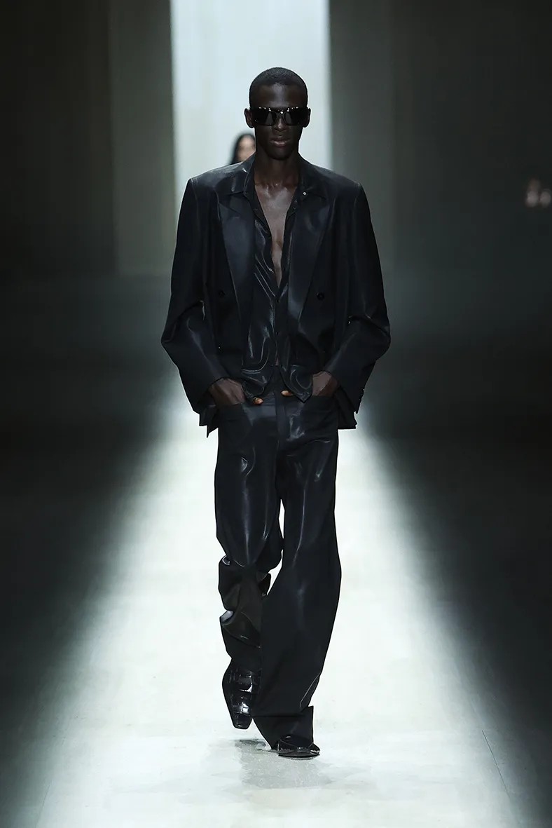 실제로 이번 쇼에서는 옷보다 자신감 넘치는 분위기가 더 강하게 느껴졌다. 모델들은 뎀나의 지시에 따라 자신을 과장한 캐릭터처럼 걸었고, 런웨이에는 래퍼 페이크밍크와 넷스펜드도 등장했다. 스케이터 스타일의 스키니 진과 모노그램 패니 팩을 착용한 페이크밍크는 런웨이 중간에서 휴대폰을 꺼내 몇 초 동안 느긋하게 스크롤을 하기도 했다. 뎀나는 이렇게 설명했다. “오늘 런웨이와 관객석에는 제가 음악을 듣고 예술을 소비하는 사람들이 많이 있습니다. 문화적 동시대성은 항상 언더그라운드에서 나오지, 메인스트림에서 나오지 않습니다.” 이 래퍼들은 쇼에서 거대한 보디빌더 모델들과 대비되는 존재였다. 마른 체형에 밀착된 실루엣은 과거 발렌시아가에서 뎀나가 즐겨 사용하던 볼륨감 있는 실루엣과 완전히 다른 방향이었다.