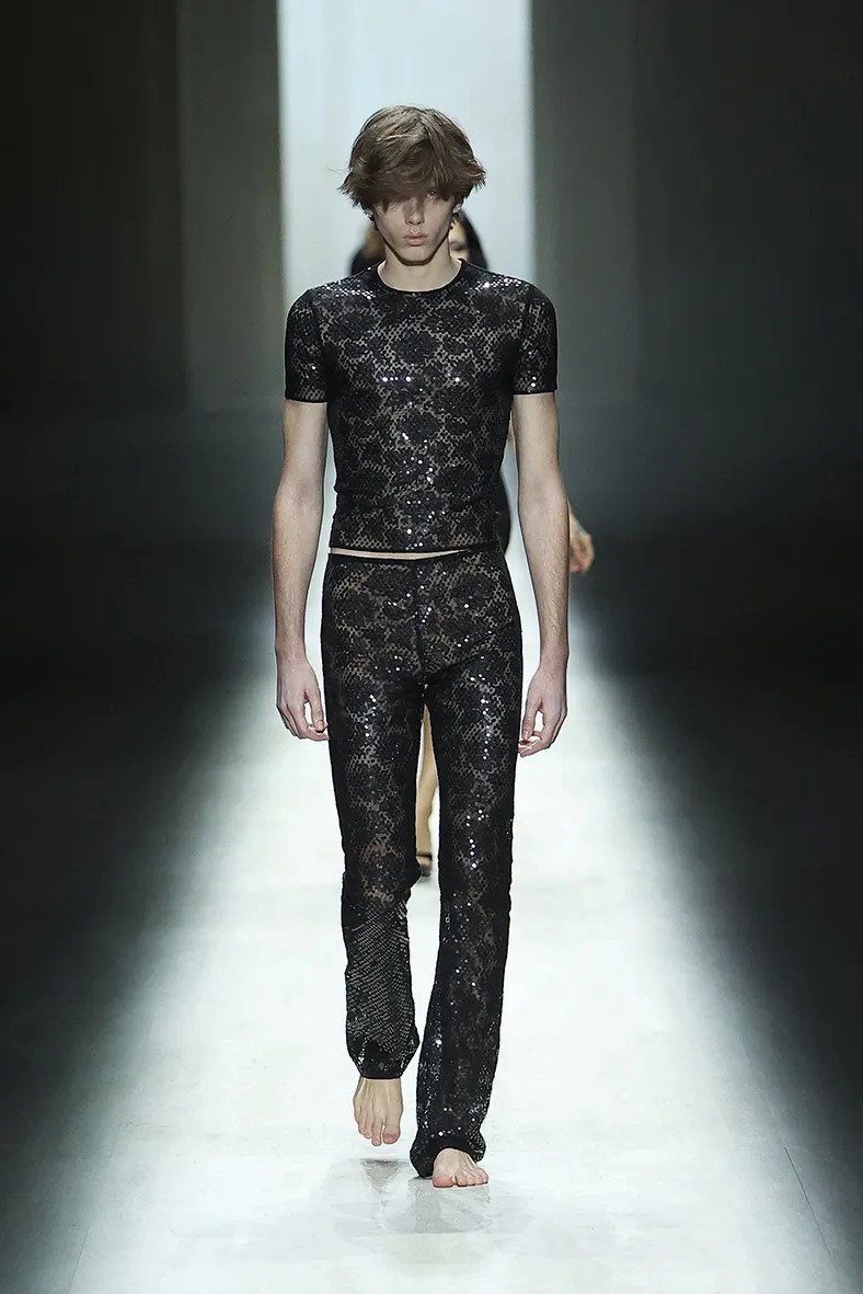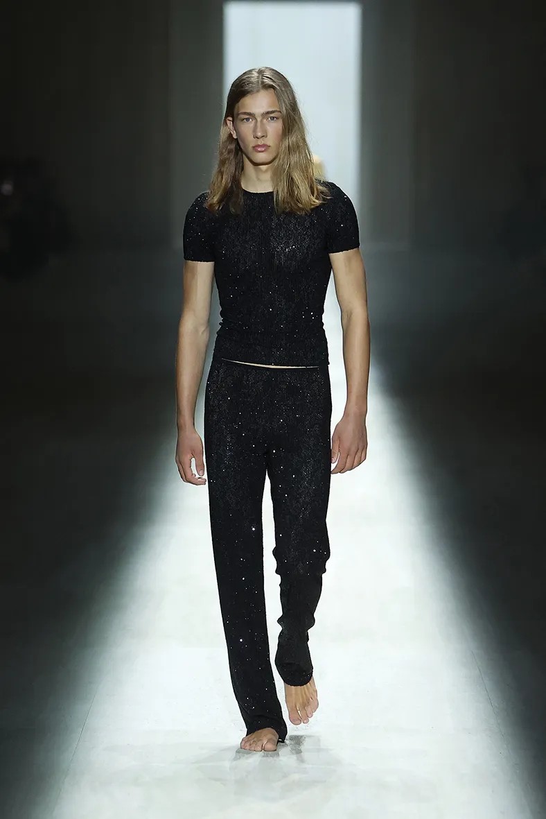 백스테이지에서 그는 또 하나의 개인적인 변화도 이야기했다. 최근 ‘룩스맥싱’ 문화와 다이어트 약물(GLP-1)이 유행하는 시대 속에서 자신의 몸과 관계를 다시 생각하게 되었다는 것이다. “섹시한 옷을 디자인하는 게 굉장히 해방감을 줍니다. 저 자신과 제 몸에 대한 인식이 달라졌기 때문이죠. 저는 섹시하게 느끼고 싶고, 매력적으로 보이고 싶어요.” 컬렉션에는 뎀나가 만든 최고의 수트 중 일부도 포함됐다. 유려하게 흐르는 실루엣과 광택 있는 소재가 특징이었다. 이어 체조 선수 같은 몸을 가진 모델들이 반짝이는 파자마 세트를 입고 맨발로 등장했다. 쇼의 마지막에는 케이트 모스가 등장했다. 과거 톰포드 시대의 구찌 뮤즈였던 그녀는 깊게 파인 등 라인의 드레스를 입고 런웨이를 걸었다. 그 아래에는 크리스털로 장식된 모노그램 G-스트링이 보였다.