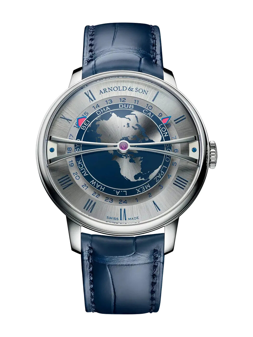 월드타임 시계가 다이얼 전체를 훔쳐버릴 정도로 강한 존재감을 내는 경우는 드물지만, 글로브트로터는 말 그대로 손목 위에 지구를 올려놓은 제품. 컬렉터 빌 애들러는 이렇게 말한다. “아놀드 앤 손 글로브트로터 골드는 개인 제트기에 탈 때 완벽한 월드타임 시계일지 모르지만, 혹시 급하게 상업 항공편을 타야 한다면 모든 시선은 이 시계로 향할 겁니다. 래커 다이얼 위의 입체적인 지구본과, 우리 세계의 연결성을 드러내는 솔리드 골드 브리지가 엄청난 존재감을 내뿜거든요. 객실 승무원이 조명을 낮추면 지구의 야광 윤곽선이 마치 우주에서 지구를 내려다보는 것처럼 빛납니다.” 절제된 디자인이냐고? 전혀 아니다. 재밌냐고? 100퍼센트다. 가격 문의. 아놀드 앤 손 홈페이지.