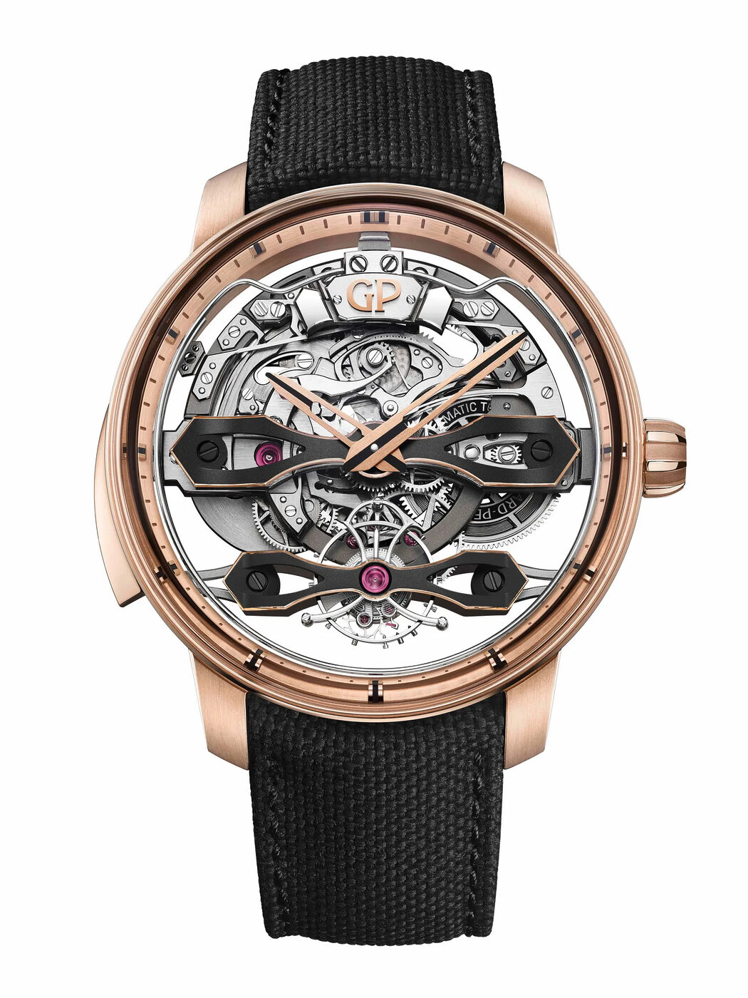 이번에는 총 475개의 부품으로 구성된 자동 스켈레톤 미닛 리피터 무브먼트 GP9530을 공개했다. 이 놀라운 엔진은 46mm 핑크 골드 케이스의 미닛 리피터 플라잉 브리지스에 탑재되며, 지라르 페리고의 기술력을 극대화한 초고난도 모델이다.