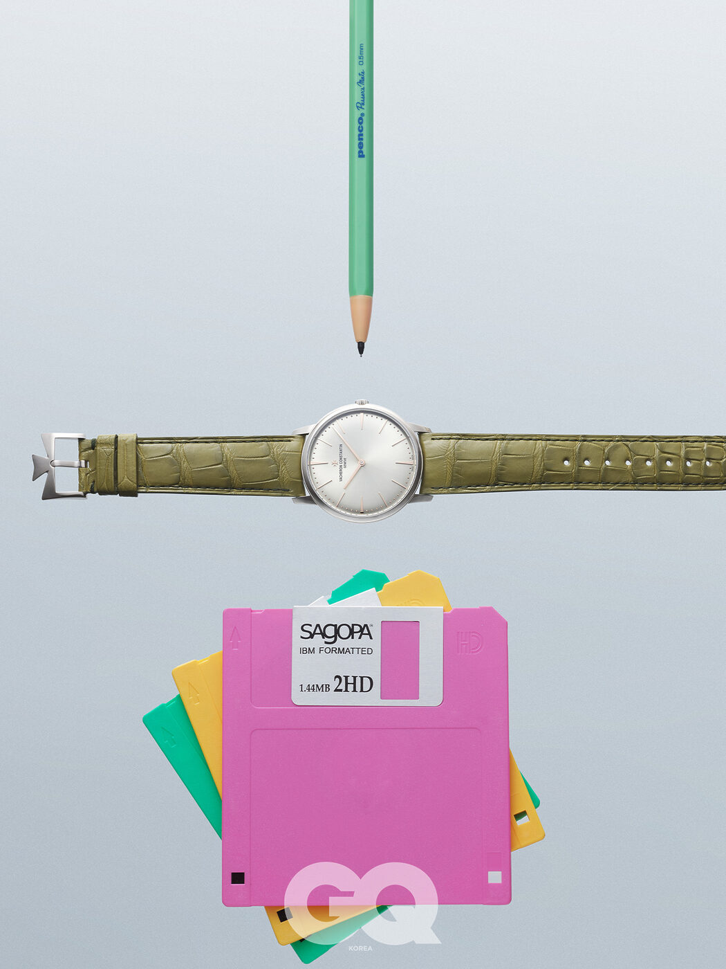 군더더기 없이 말간 실버 다이얼 위로 핸즈와 인덱스, 그리고 미닛 트랙만 올리고 올리브 그린 레더 스트랩으로 마무리해 간결한 미학을 살렸다. 7.72밀리미터의 케이스 두께는 셔츠에 쏙 감출 수 있을 정도로 슬림하지만, 동시에 42시간의 막강한 파워 리저브를 갖춘 듬직한 시계다. 패트로모니 매뉴얼 와인딩 4천1백20만원, 바쉐론 콘스탄틴.