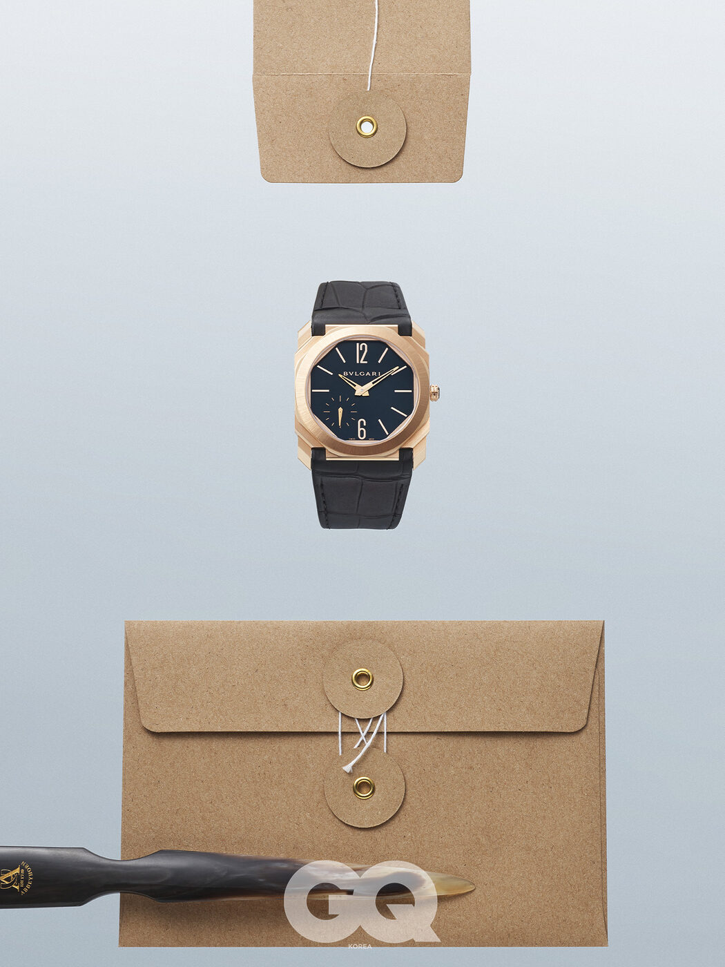팔각형과 원형을 절묘하게 결합한 케이스, 칠흑같이 깊은 블랙 매트 다이얼, 우아한 엘리게이터 레더 스트랩까지. 옥토 로마의 디자인을 여실히 살린 시계다. 클루 드 파리 패턴이나 길로셰 기법 없이 로즈 골드 케이스와 6.4밀리미터의 얇은 두께만으로 우아한 실루엣을 완성했다. 옥토 피니씨모 오토매틱 3천8백50만원, 불가리.