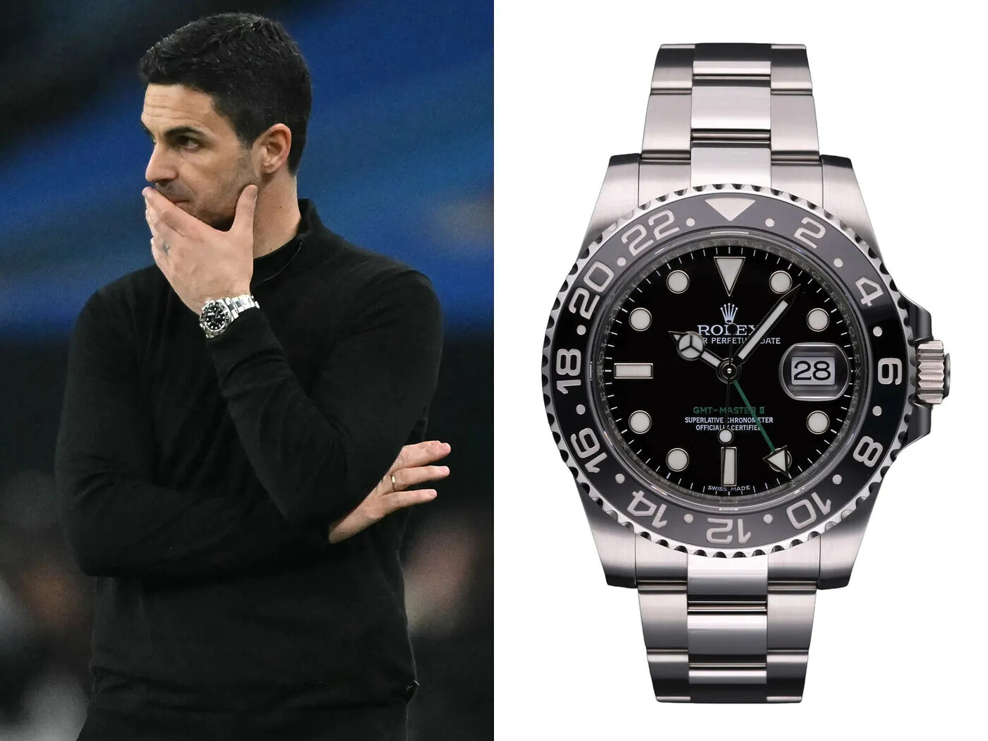 ‘원 워치’ 스타일을 고수하는 아르테타는 이번에도 늘 차던 스틸 롤렉스 GMT-마스터 II를 착용했다. 실용적인 시계다. 유럽을 오가며 챔피언스리그 일정을 소화할 때 GMT 기능은 분명 유용할 것이다. 컬러풀한 다른 GMT 모델들과 달리, 올블랙 베젤이라 과하지 않고 담백한 점도 특징이다.