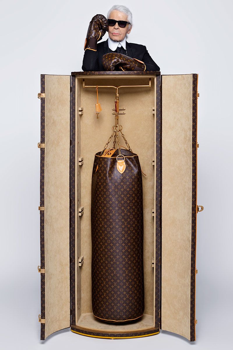 LOUIS VUITTONㅣ루이 비통의 시그니처 패턴인 모노그램으로 뒤덮은 복싱 아이템. 샌드백을 닮은 펀칭 백과 트렁크, 글러브 등 모두가 칼 라거펠트의 생전 작품이다.