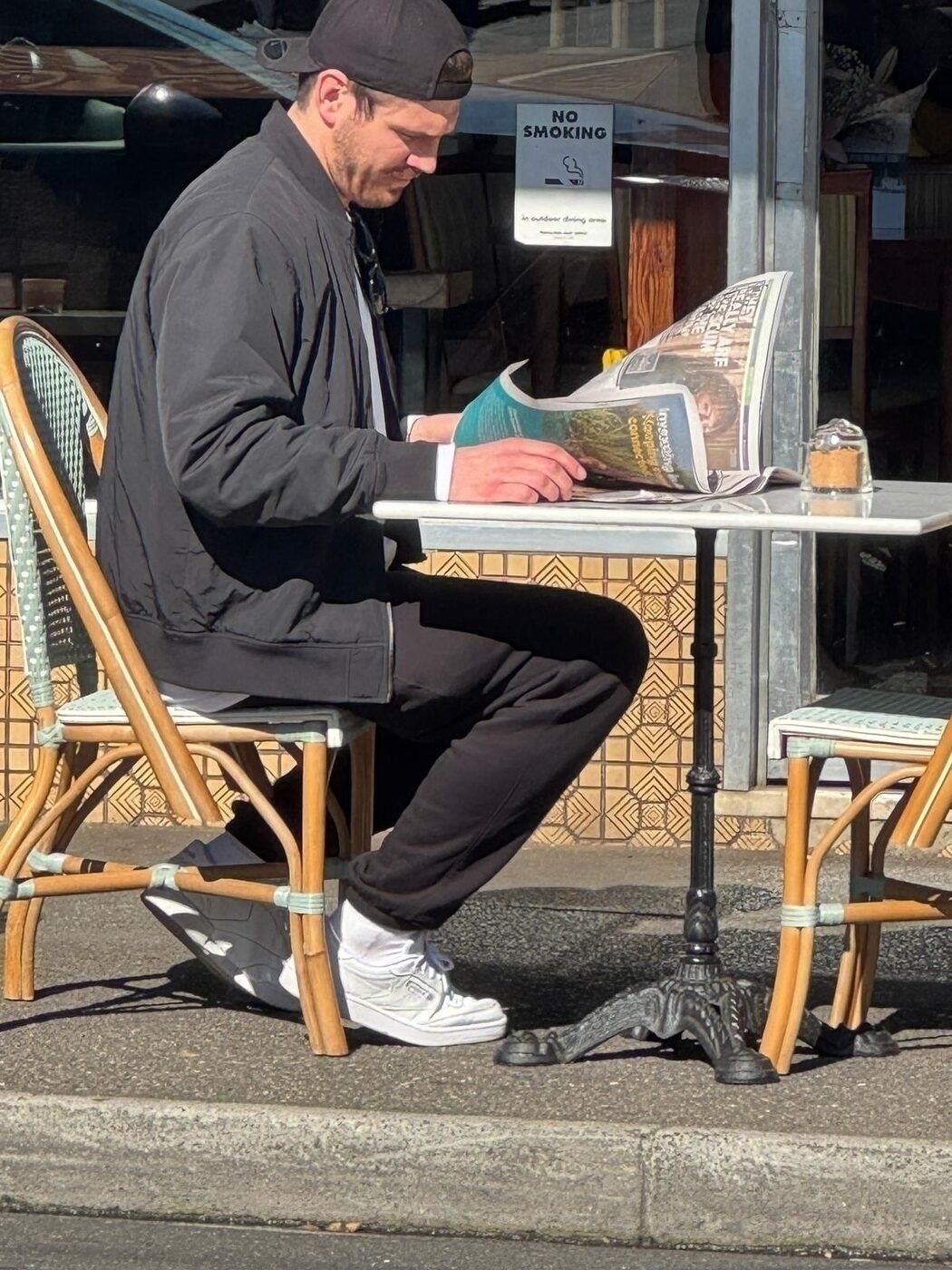 오늘 읽히는 책 목록도 만만치 않다. 엘레나 페란테의 ‘나의 눈부신 친구’, 앤서니 보데인의 ‘키친 컨피덴셜’ 등. 그 사이에서 영국 작가 톰 샤프의 ‘윌트’는 다소 튀는 선택이다. 하지만 이를 읽고 있는 해리는 콧수염과 미니 멀렛 헤어, 랄프 로렌 쿼터 집업, 구겨진 던트 북스 북마크까지 더해 존재감을 충분히 드러낸다. 27세인 그는 남성 정신건강 단체에서 일하며, 이런 독서 문화가 ‘매노스피어’ 인플루언서들이 제시하는 빠른 해결책보다 훨씬 건강하다고 말한다. “저는 퍼포머티브하게 읽지 않아요. 그런 이미지로 보일까 봐 두려워서요. 요크셔 출신이라 그런 건 잘 안 통하거든요.”