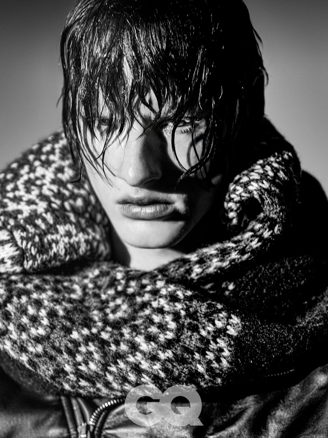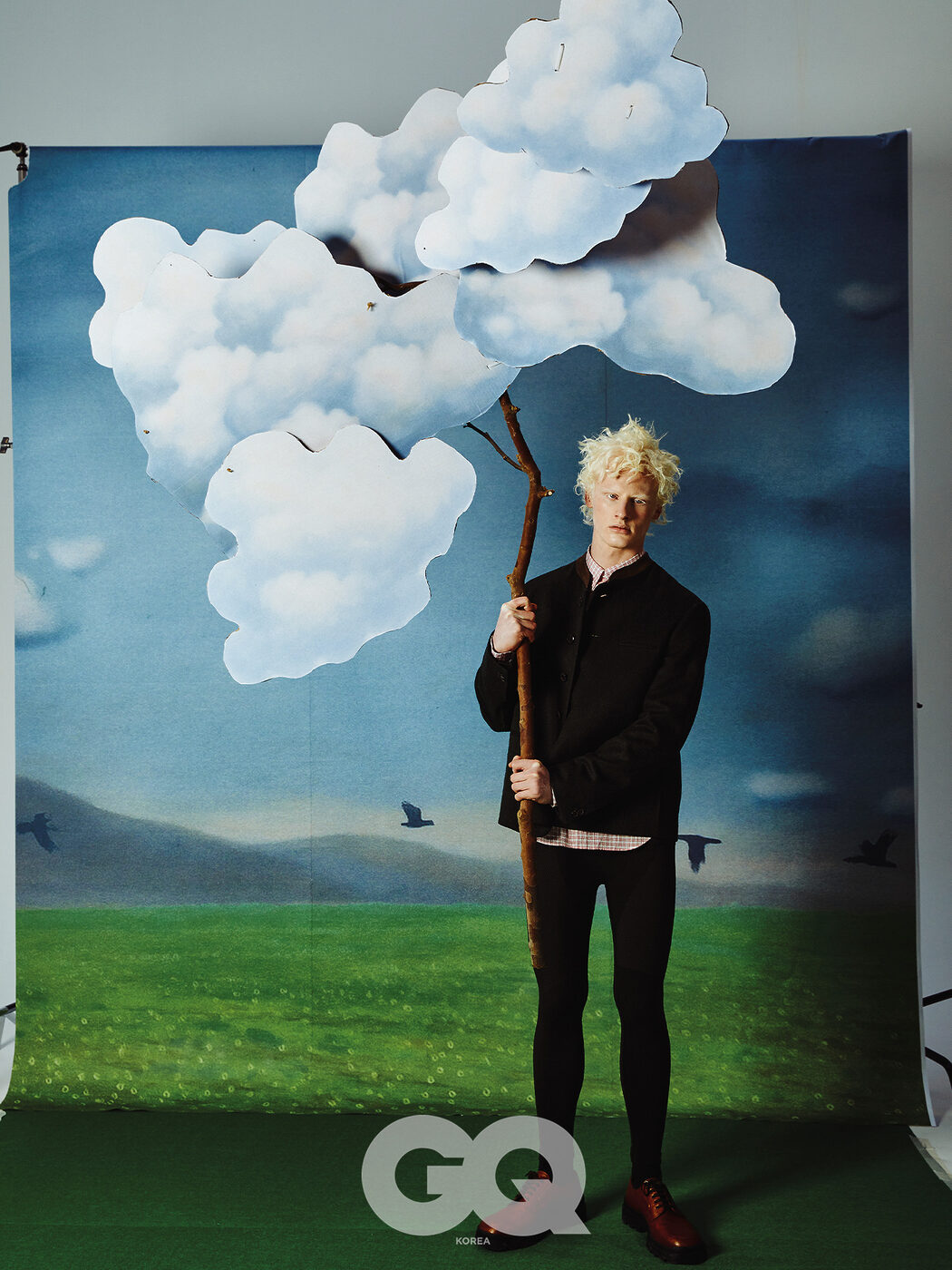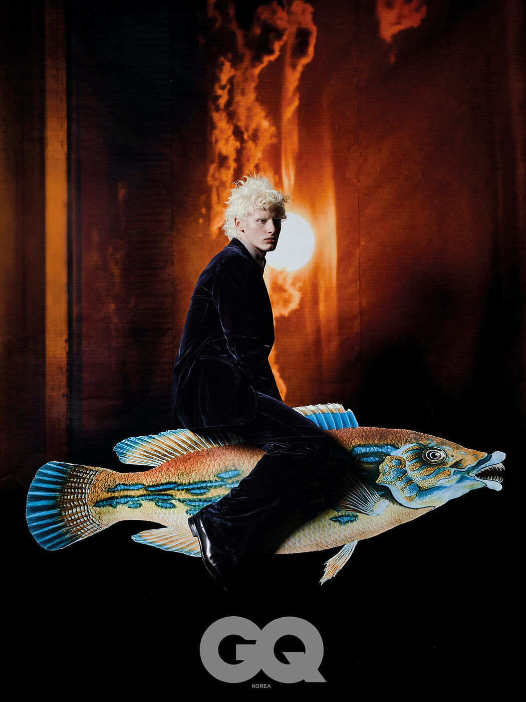네이비 벨벳 수트, 그레이 셔츠, 블랙 드레스 슈즈, 모두 에르메스.