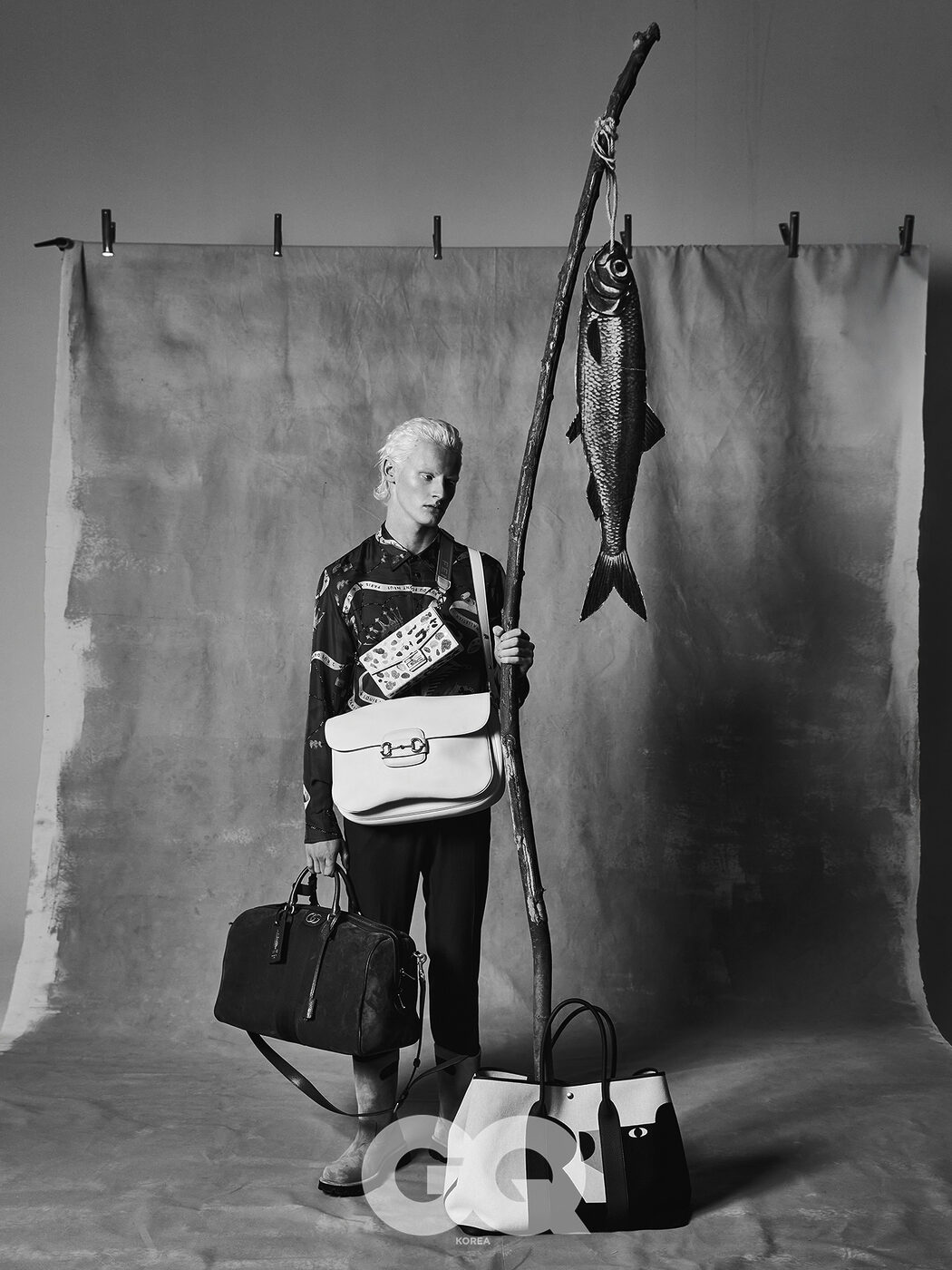 프린티드 셔츠와 블랙 팬츠, 모두 루이 비통. 부츠, 로에베. 멀티 컬러 크로스 백, 펜디. 홀스빗 1955 라지 크로스 백, 블랙 사보이 더플백, 모두 구찌. 가든 파티 49 보야지 백, 에르메스.