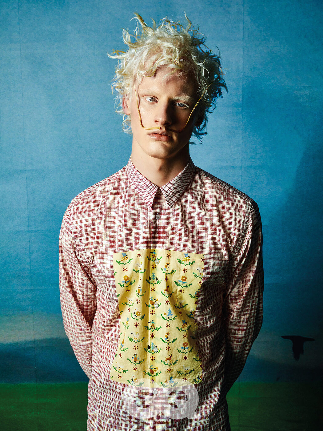 플레이드 맨 베스트와 맨 셔츠, 부츠컷 맨 진, 옐로 맨 블로퍼, 카프스킨 앤 태슬 레이디 디올 백 스몰, 모두 디올.