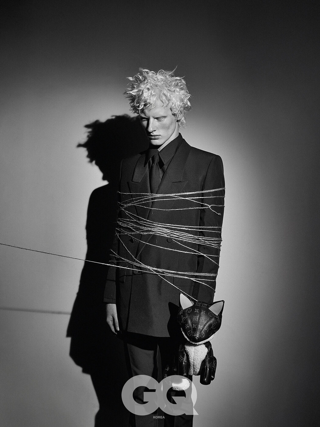 더블 브레스트 수트, 블랙 셔츠, 블랙 타이, 모두 구찌. 모노그램 폭스 백, 루이 비통.