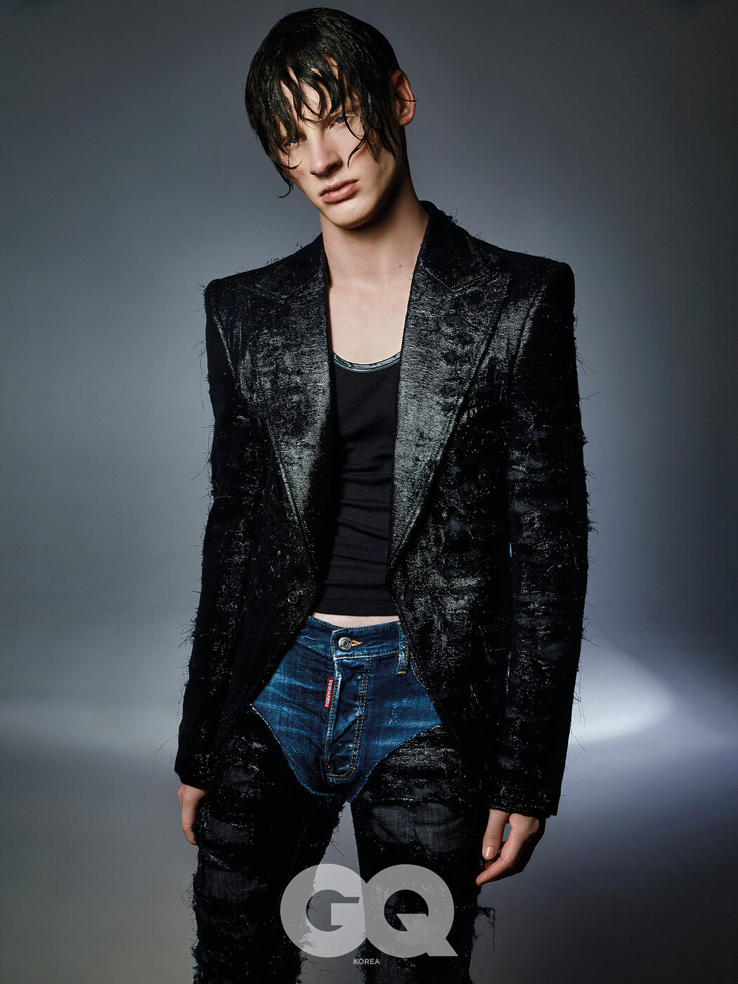 블랙 텍스처 블레이저, 블랙 톱, 챕스 진, 모두 디스퀘어드2.