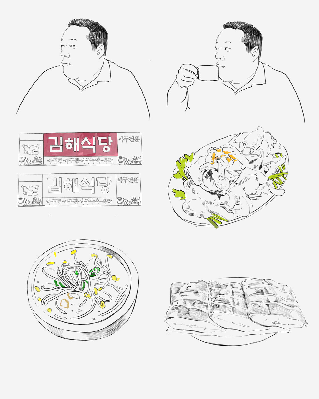 12:00 합천국밥집 부산에서 가장 좋아하는 돼지국밥집이다. 특히 좋아하는 모둠따로국밥은 맑고 깔끔하며 시원한 국물, 고기, 내장, 순대가 푸짐하게 들어간 맛있는 건더기가 포인트다. 고기 맛을 보면 국물의 맛이 없을 수 없다는 사실을 깨닫는다. 새우젓 살짝 넣고, 다대기는 처음부터 풀지 말고 맑은 국물부터 맛보기를 권한다.