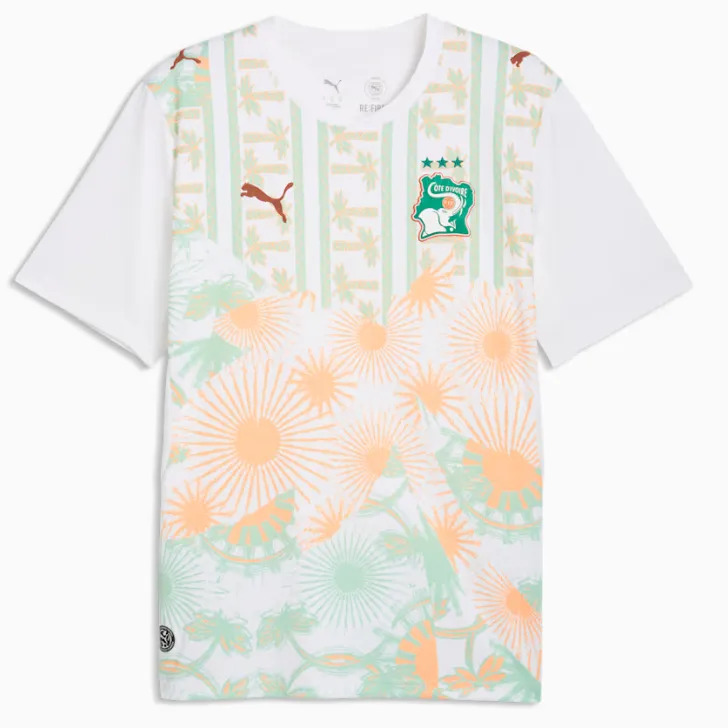 오렌지를 입는 팀이 네덜란드만 있는 건 아니다. 코트디부아르의 홈 유니폼은 은근하면서도 감각적인 패턴과 언제나 매력적인 코끼리 로고 덕분에 강하게 눈에 들어온다. 화이트 원정 유니폼은 훨씬 과감한 시도지만, 이 역시 생동감 있는 홈 킷처럼 국가의 색을 모두 담아내면서도 과하지 않고, 보는 재미를 주는 디자인으로 완성됐다.