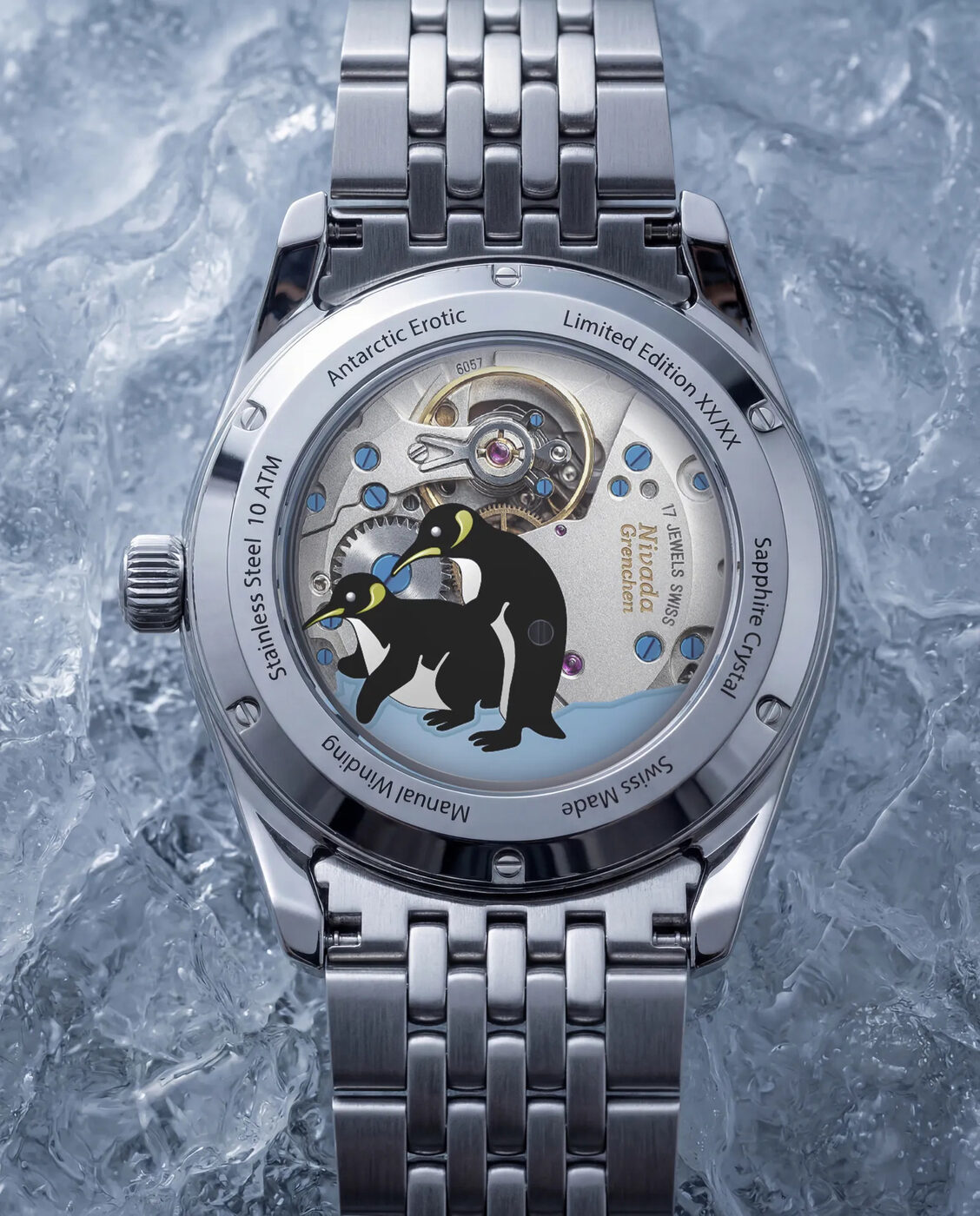 이처럼 본격적인 탐험용 시계를 기반으로, 니바다 그렌헨은 그 미 해군 대원들이 남극에서 ‘마주쳤을지도 모를’ 세계까지 확장해 해석했다. 다이얼은 작게 적힌 ‘Erotic’이라는 필기체를 제외하면 매우 단정하고 기능적인 모습이지만, 케이스백은 완전히 다른 이야기를 펼친다. 시계를 뒤집으면 만화처럼 표현된 두 마리 펭귄이 교미하는 장면이 등장하고, 태엽을 감으면 이 장면이 실제로 움직인다.