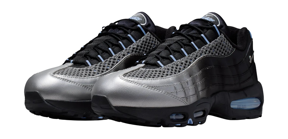 이번 에어 맥스 95 디자인에서 팔라스는 또 다른 전설적인 컬러웨이, ‘실버 불릿’ 에어 맥스 97에서 영감을 얻었다. 출시 이후 오랫동안 사랑받아온 이 모델은 메탈릭 실버 어퍼로 유명하다. 단순하지만 강렬한 이 디자인은 지금도 많은 팬들에게 사랑받고 있다. 하지만 팔라스는 단순한 오마주에 머무르지 않았다. 스케이트 문화의 요소를 더했다. 에어 맥스 95 특유의 그라데이션 컬러를 유지하면서도, 어퍼 전체에 메탈릭 실버를 입혔다. 토박스에서는 강하게 시작된 실버가 뒤로 갈수록 점점 흐려지며 힐로 이어지고, 힐은 아웃솔과 맞춘 블랙으로 마무리된다. 마치 블랙 에어 맥스 95 위에 실버 스프레이를 뿌린 듯한 효과다. 에어 맥스 유닛에는 은은한 블루 컬러 포인트도 더해졌다.