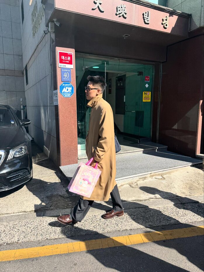 허키 스타일의 핵심은 과하지 않은 디테일이다. 그중에서도 가장 눈에 띄는 건 늘 함께하는 안경. 블랙 뿔테나 선글라스를 자주 착용하는데, 특히 옐로우 톤이 살짝 도는 렌즈를 선택한 것이 포인트다. 이때 중요한 건 프레임이다. 동그란 안경보다는 각이 살아 있는 사각 프레임이 얼굴선을 또렷하게 잡아주면서, 특유의 시니컬한 이미지를 정돈된 인상으로 바꿔준다. 평범한 룩에 변화를 주고 싶다면, 그처럼 컬러 렌즈 안경 하나만 더해보자.