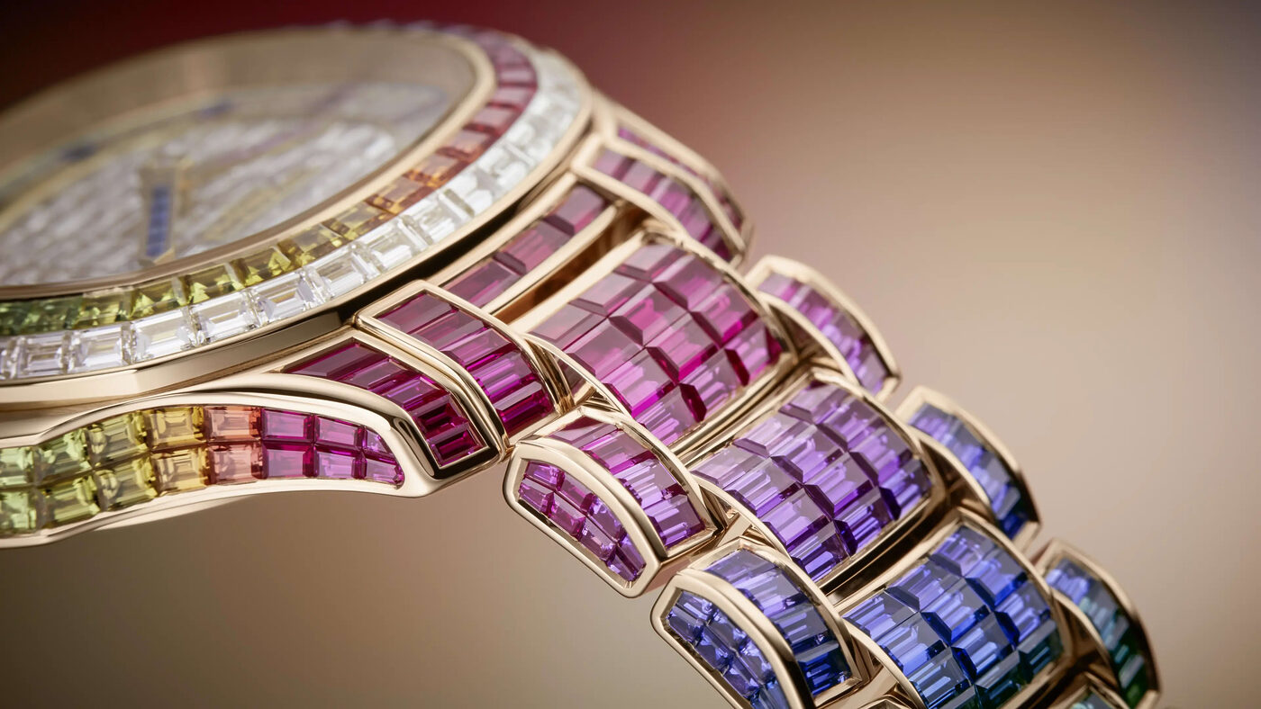 화려함, 강렬한 존재감은 부차적인 이유. 하이엔드 시계 브랜드들이 무지개색 시계를 만드는 이유에는 우선 경지에 이른 젬 세팅 기술력 과시, 그리고 천연 보석 배합에서 비롯된 압도적 희소성과 자산가치가 있다. 더불어 SNS에 올렸을 때 눈에 띄는 색감은 젊은 부유층을 끌어들이며, 시계를 ‘손목 위 예술 작품’으로 보이게 하는 효과까지 안고 있으니. 이름처럼 무지갯빛 장점을 고루 갖춘 디자인인 셈이다.