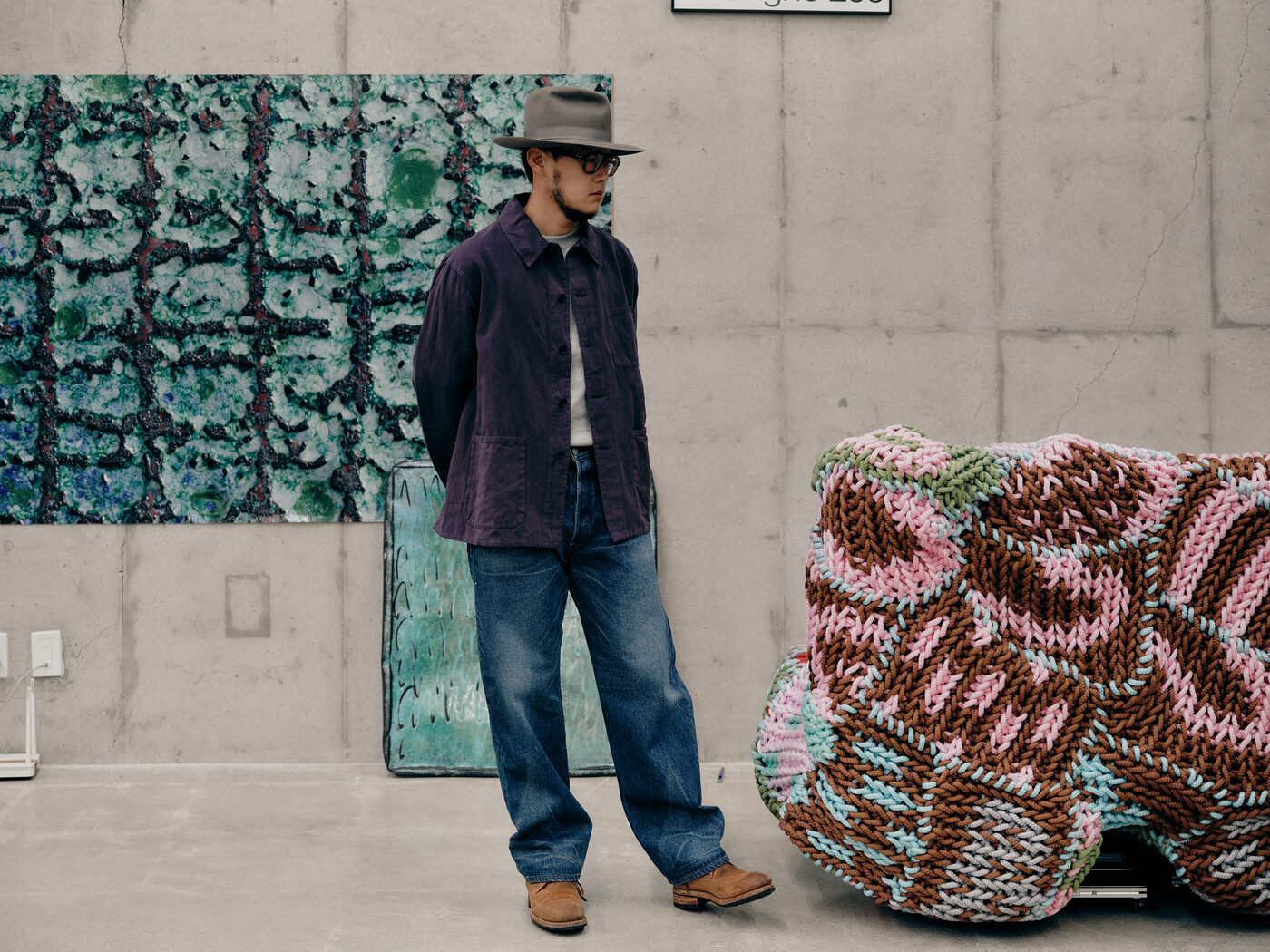 그가 입는 데님 역시 비슷한 흐름을 따른다. 처음에는 단단하고 균일해 보이지만, 작업을 거듭할수록 천천히 변한다. 손이 자주 닿는 부분은 옅어지고, 몸이 접히는 자리는 자연스럽게 주름이 자리 잡는다. 그 변화는 의도된 디자인이 아니라 사용의 결과다. 그래서 그의 옷은 어느 순간부터 새것의 상태를 벗어나, 작업의 일부처럼 보이기 시작한다.