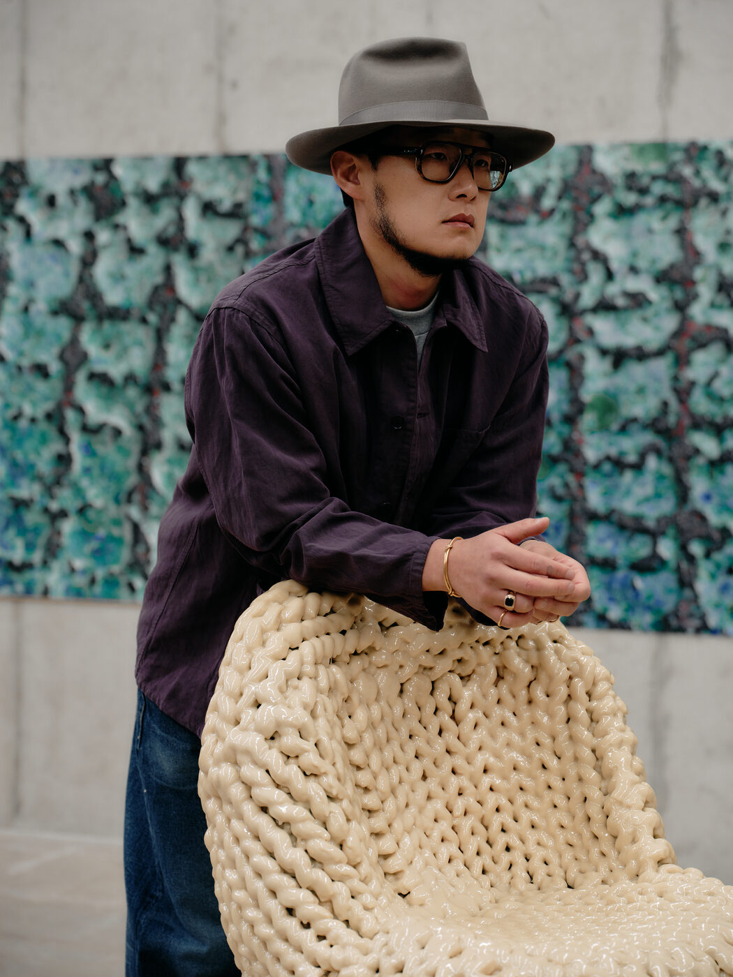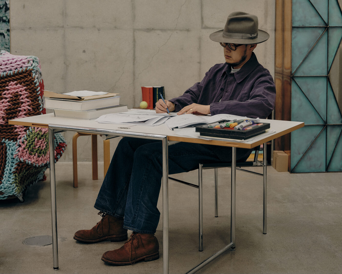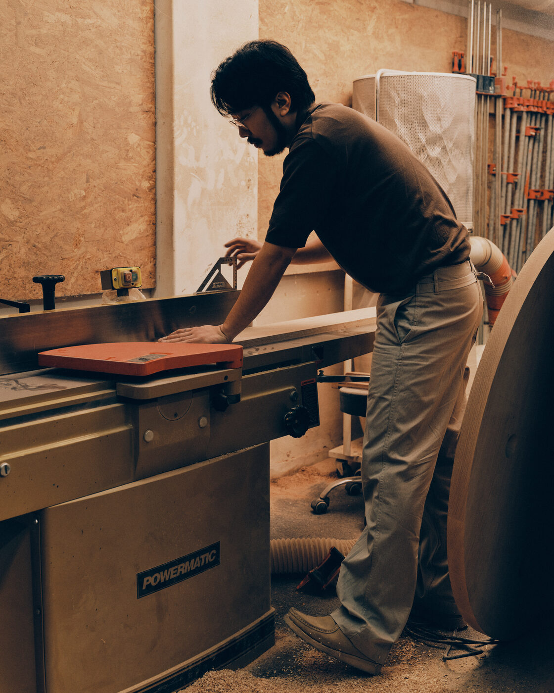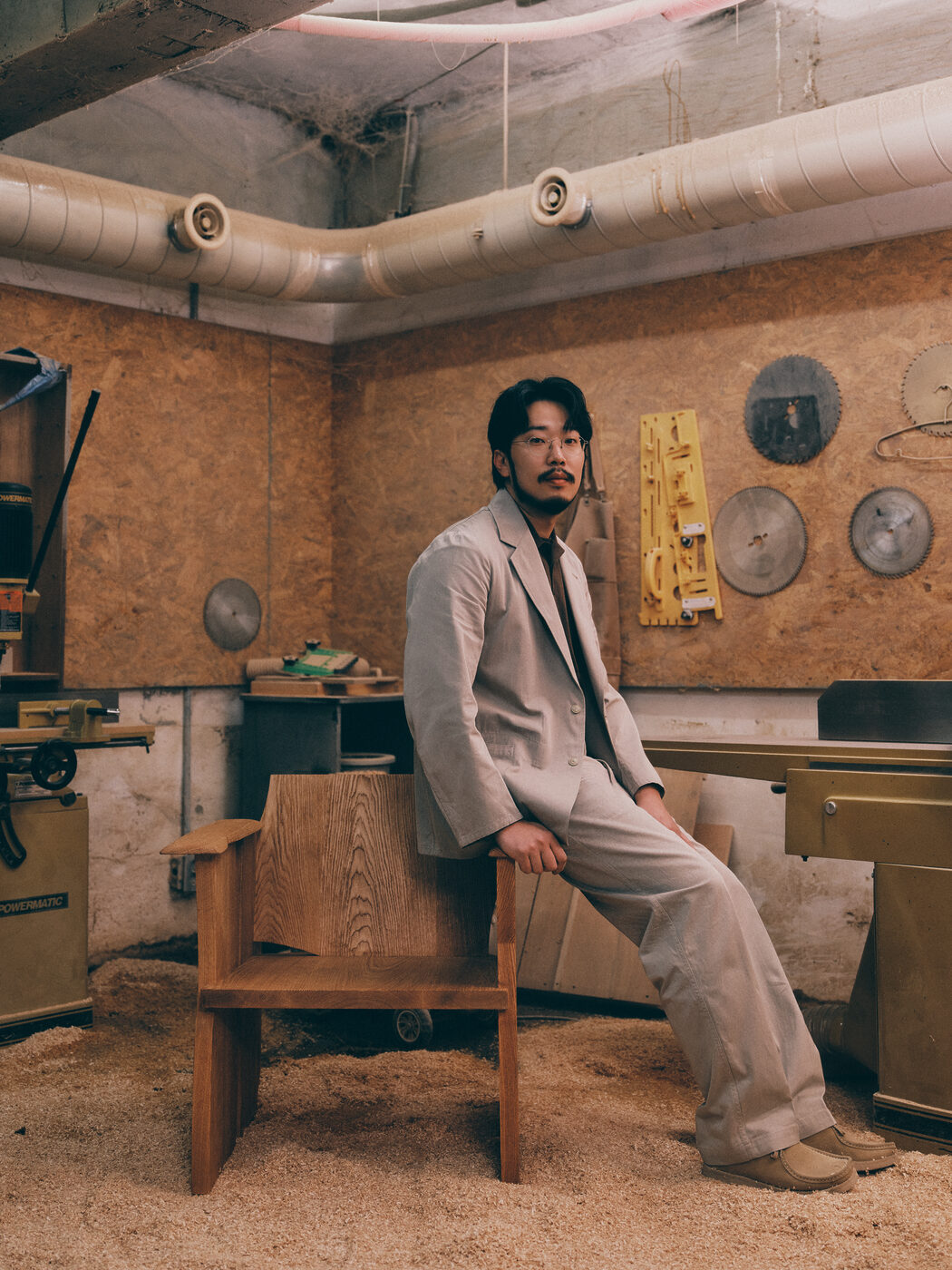 그가 입는 옷도 비슷한 방식으로 선택된다. 눈에 띄기보다 조용히 기능하는 재킷, 과장 없이 균형을 잡아주는 셋업. 작업대 앞에서 몸을 기울이고, 손을 뻗고, 다시 자리를 옮기는 일련의 동작 속에서도 옷은 따로 의식되지 않는다. 대신 반복되는 움직임을 따라가며 조금씩 형태를 바꾼다. 옷을 작업의 리듬을 해치지 않으면서도 오래 함께할 수 있는 친구로 활용하는 것이다.