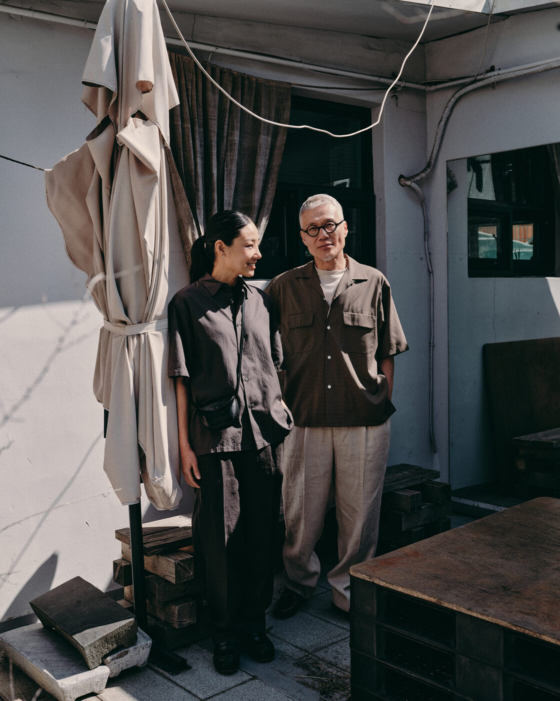 김수연과 임상완은 각기 다른 일을 하지만, 결국 같은 방식으로 하루를 보낸다. 만들고, 다루고, 쌓아가는 일. 가구를 만들고, 원단을 다루고, 술을 빚는 시간은 모두 손을 거쳐야 완성된다. 이들이 입은 캡틴선샤인의 옷은 특정한 역할을 요구하지 않는다. 작업실에서도, 바깥에서도, 자연스럽게 이어진다. 옷을 갈아입는 순간이 필요 없을 만큼, 하루의 흐름 안에 부드럽게 스며든다. 편안함은 기본이고, 무엇보다 오래 입어도 질리지 않는 균형을 가지고 있다.