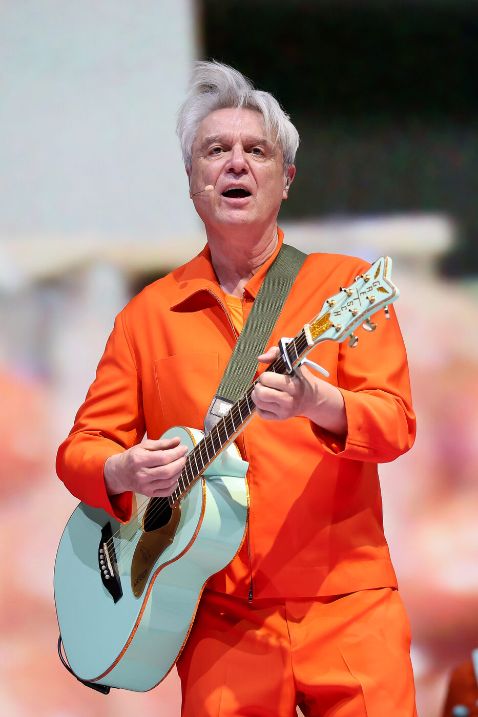 데이비드 번은 코첼라 무대에서 신곡과 토킹 헤즈의 대표곡을 선보였다. 공연 중에는 정치적 메시지도 담겼으며, 그 에너지는 밝은 오렌지 컬러 의상으로 이어졌다. 번과 백업 댄서, 보컬 모두 강렬한 오렌지 룩을 입어 시각적인 인상을 강화했다.