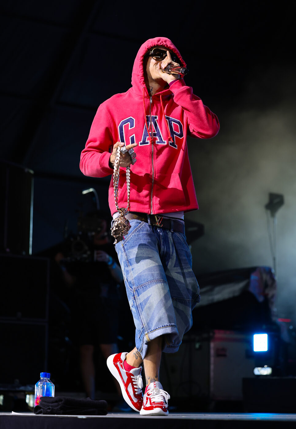 영국 래퍼 센트럴 씨는 이번 코첼라에서 가장 블로키한 스타일을 보여준 인물이다. 겉보기에는 클래식한 갭 후디처럼 보이지만, 로고 대신 ‘캡’이라는 단어가 들어간 커스텀 제품이었다. 여기에 영국 국기 패턴이 들어간 데님 쇼츠와 다이아몬드 체인을 매치했고, 루이 비통 벨트로 마무리했다.
