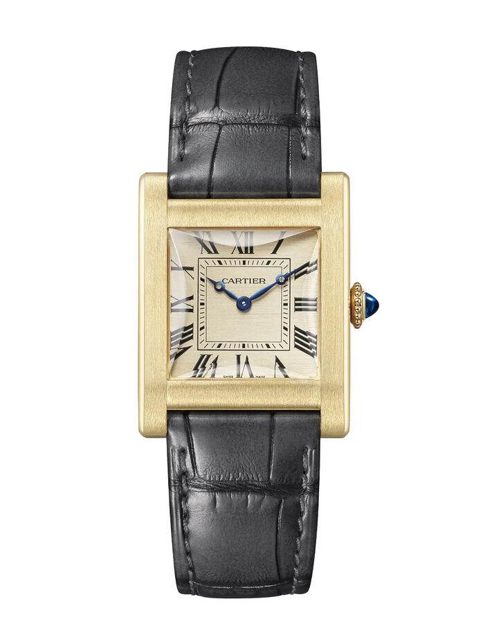 노르말은 탱크의 가장 초기 형태다. 우리가 흔히 떠올리는 직사각형 비율은 루이 까르띠에 버전이지만, 이 정사각형에 가까운 모델이 시작이었다. 이번에는 플래티넘 브레이슬릿 모델과 옐로 골드 케이스에 블랙 스트랩을 조합한 두 가지 버전이 등장했다. 특히 플래티넘 모델은 작은 사이즈에도 불구하고 강한 존재감을 보여준다.