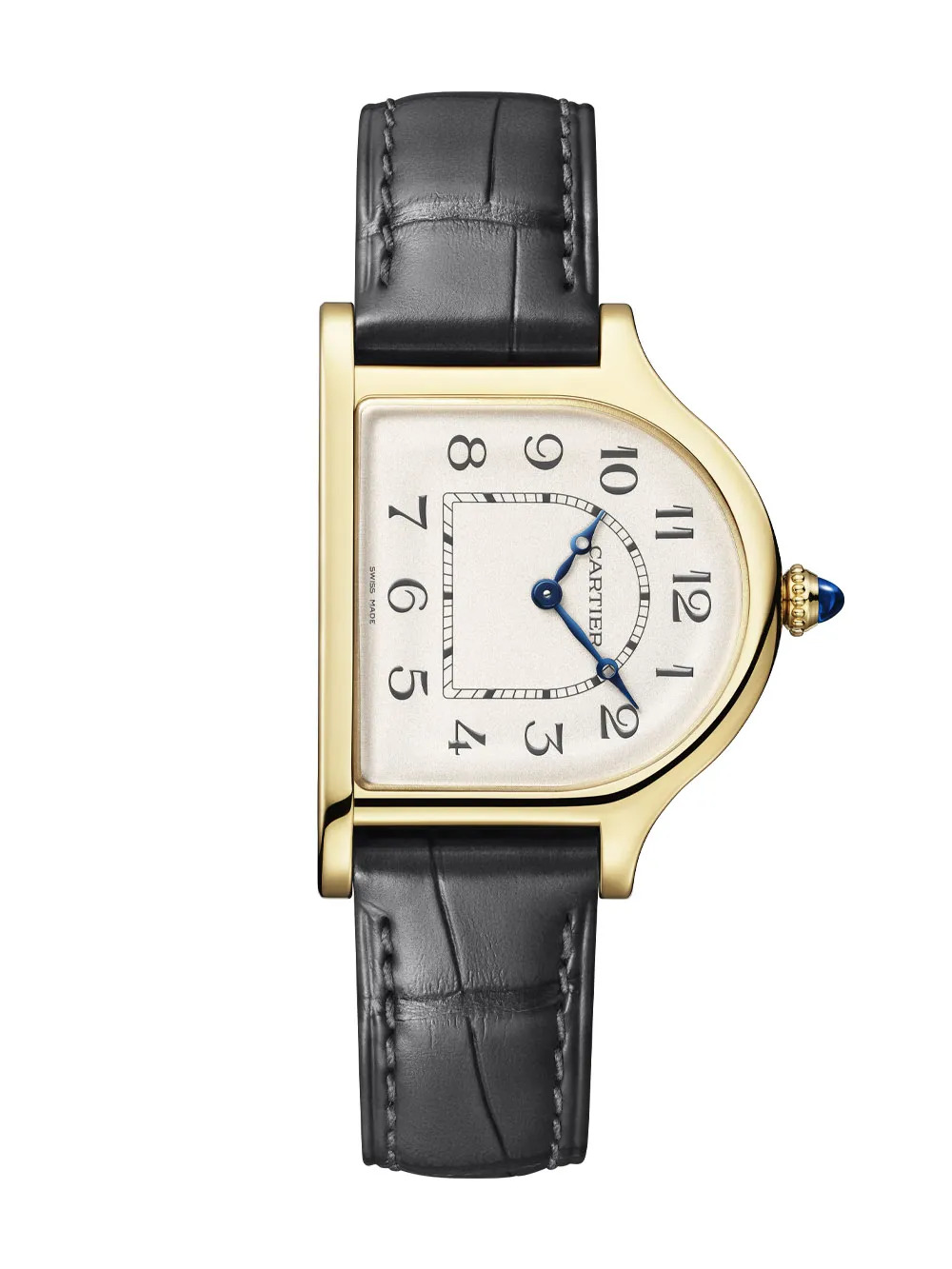 까르띠에 탱크 라인 중에서도 가장 우아한 모델은 상트레다. 길게 늘어진 케이스가 손목 곡선에 맞게 자연스럽게 휘어 있는 것이 특징이다. 이번 신작은 옐로 골드 케이스에 블루 스틸 핸즈, 로마 숫자 인덱스를 조합한 전형적인 까르띠에 스타일이다. 영화 토마스 크라운 어페어 속 스티브 맥퀸이 그대로 착용했을 법한 분위기다.