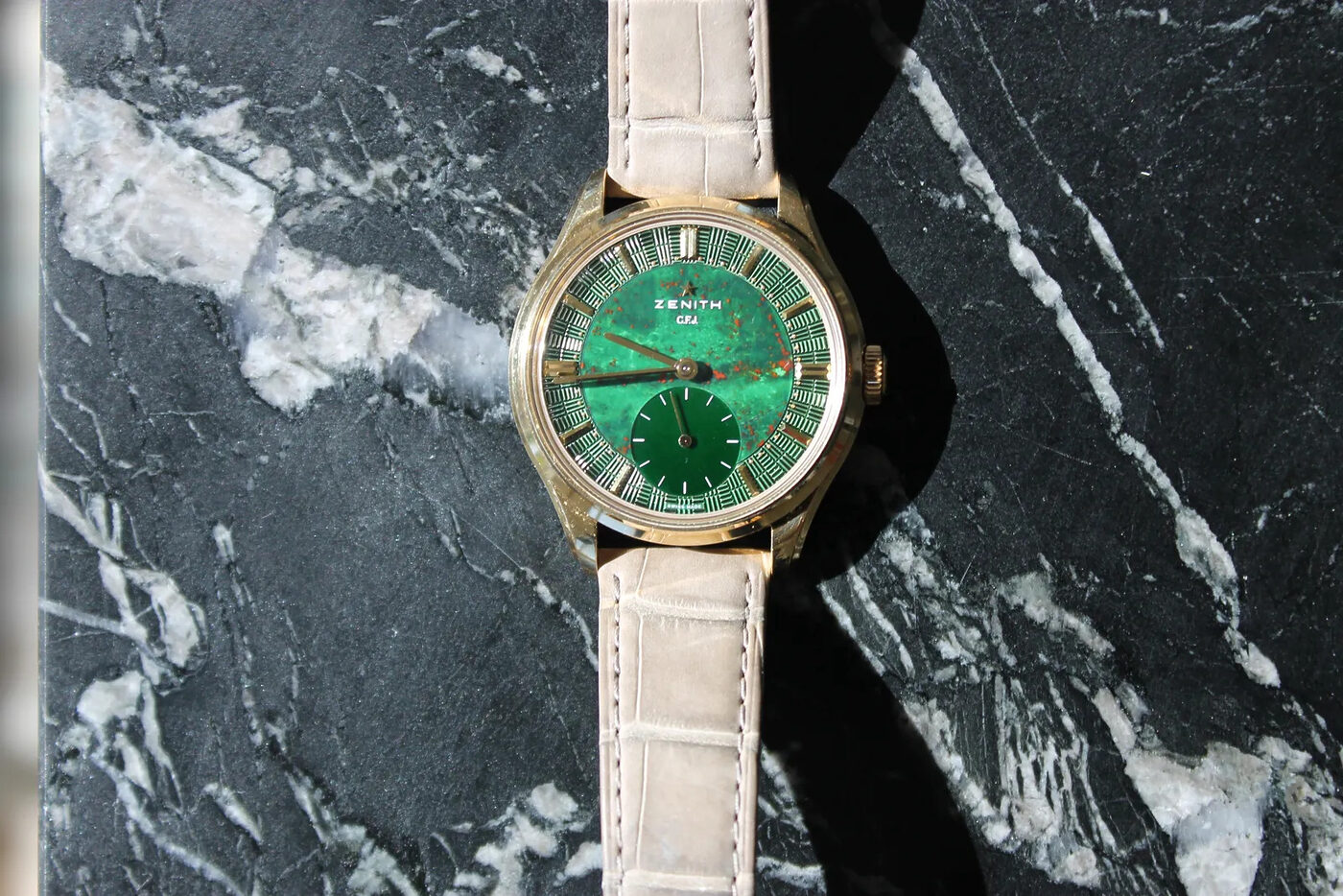 지에프제이는 의도적으로 극대화된 디자인을 지향한다. 스톤 다이얼 위에 자개를 얹은 구성은 마치 최고급 소고기 위에 트러플을 얹는 것과 같다. 이 모델이 제니스의 정점에 가까운 작업이라는 점을 강조하는 방식이다. 그리고 그 중심에는 무브먼트가 있다. 지에프제이는 제니스 역사상 가장 중요한 무브먼트 중 하나인 칼리버 135를 재해석해 탑재했다. 1949년부터 1962년까지 생산된 이 무브먼트는 정확도로 유명하며, 크로노미터 대회에서 235개의 상을 수상했다.