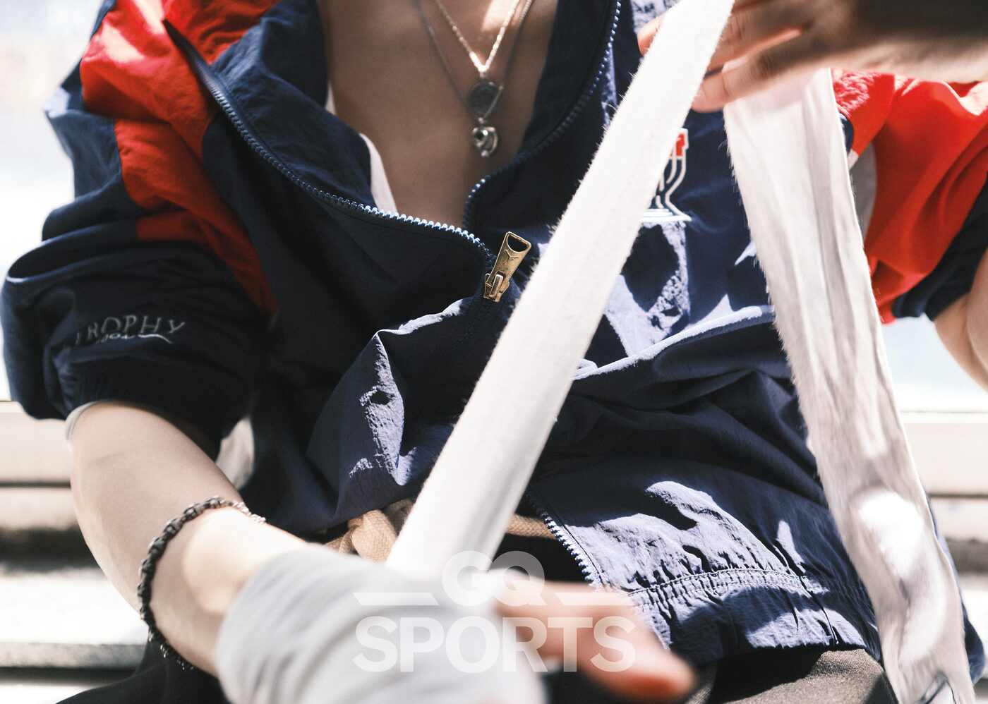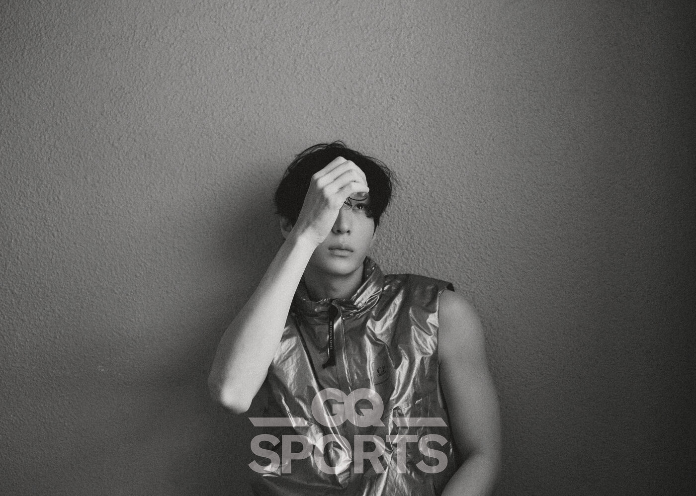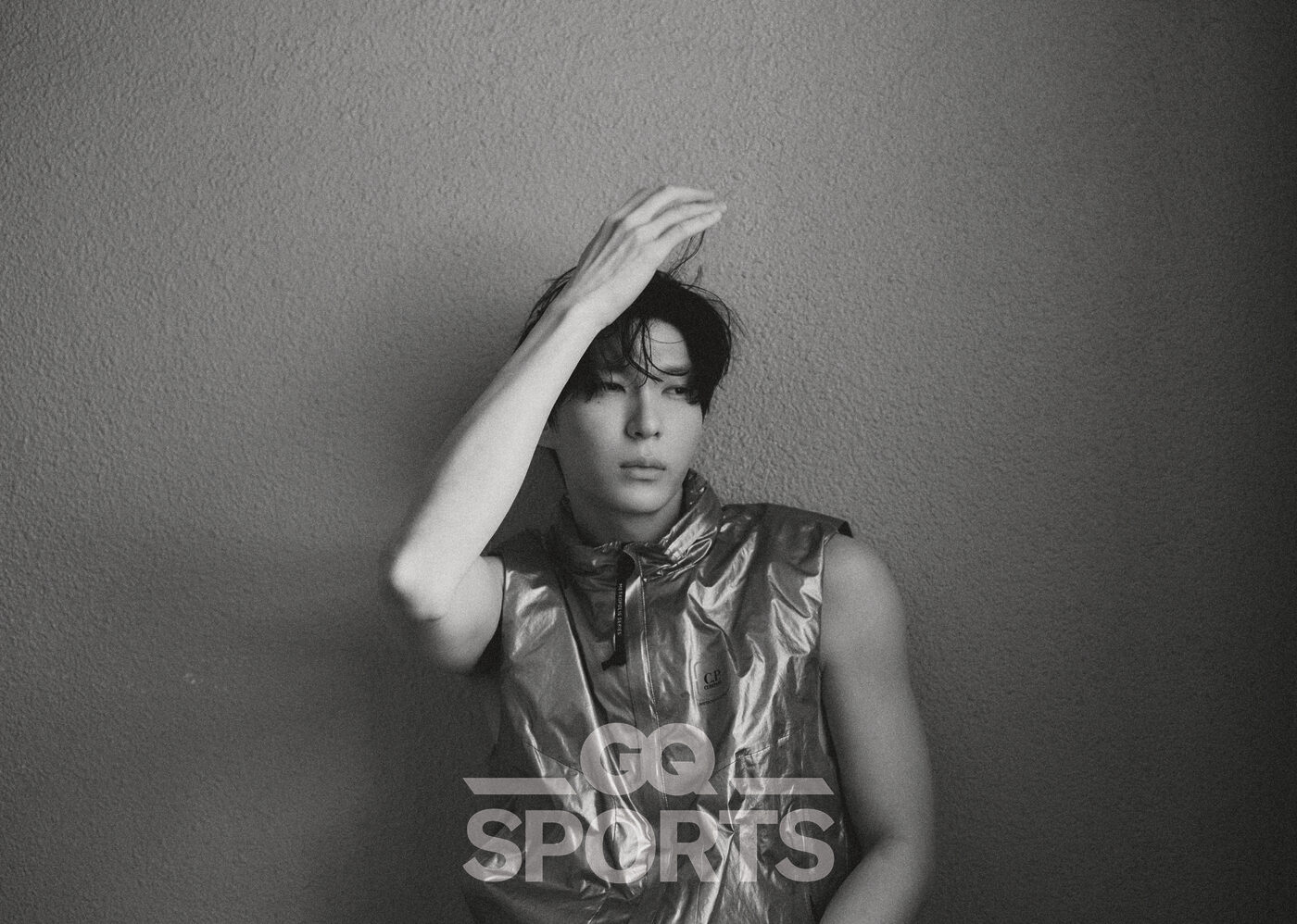 윈드브레이커, 트레이닝 팬츠, 짧은 네크리스는 모두 정택운의 것.