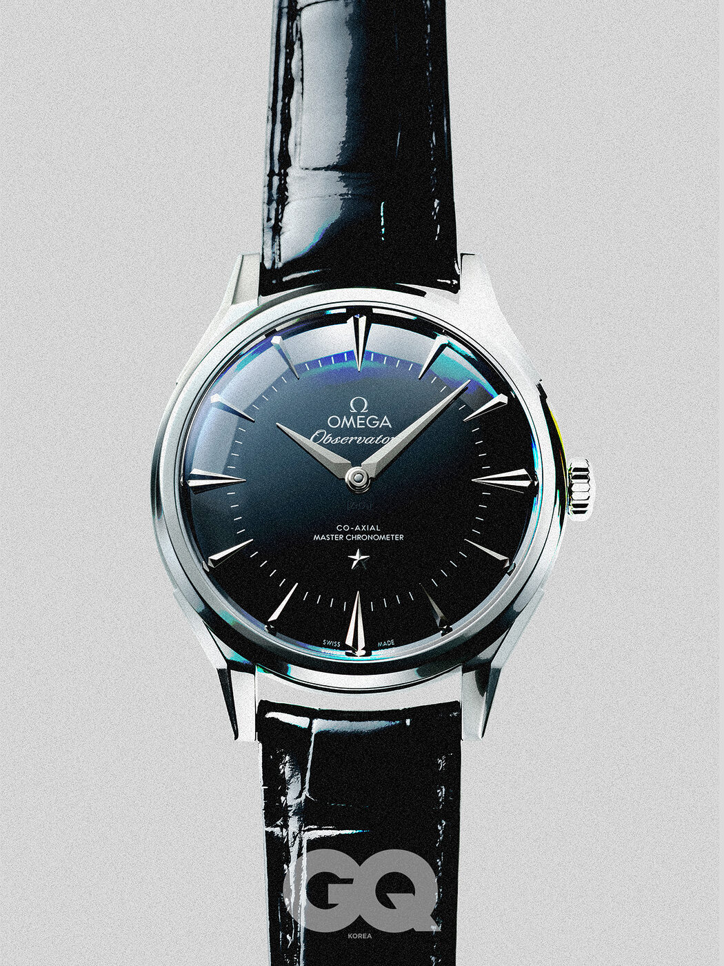 블랙 세라믹으로 완성한 다이얼을 폴리싱 처리해 보는 각도에 따라 농담이 다르게 일렁인다. 연 모양 핸즈와 인덱스는 18K 화이트 골드로 매만졌고, 은은하게 반짝이는 레더 스트랩으로 마무리했다. 컨스텔레이션 옵저버토리 39.4MM 1천7백만원대, 오메가.