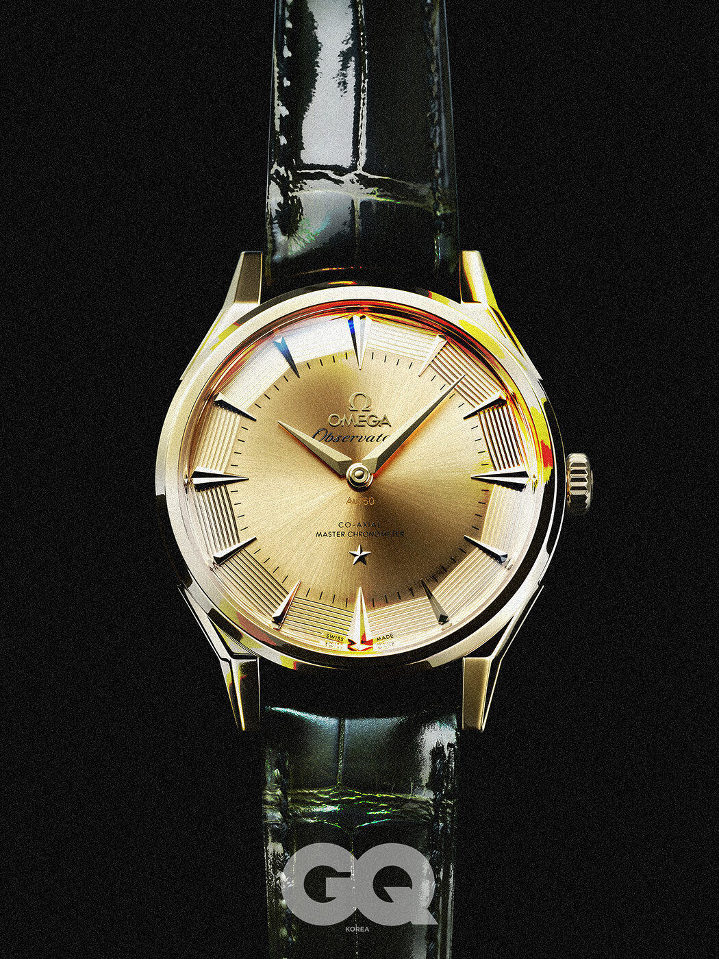 오메가의 독자적인 18K 골드 합금인 문샤인™ 골드로 제작한 케이스에 앨리게이터 레더 스트랩을 매치해 우아함을 강조했다. 12각 면의 파이 팬 다이얼에 새긴 수공 기요셰 패턴도 눈여겨볼 만한 요소. 컨스텔레이션 옵저버토리 39.4MM 5천3백만원대, 오메가.